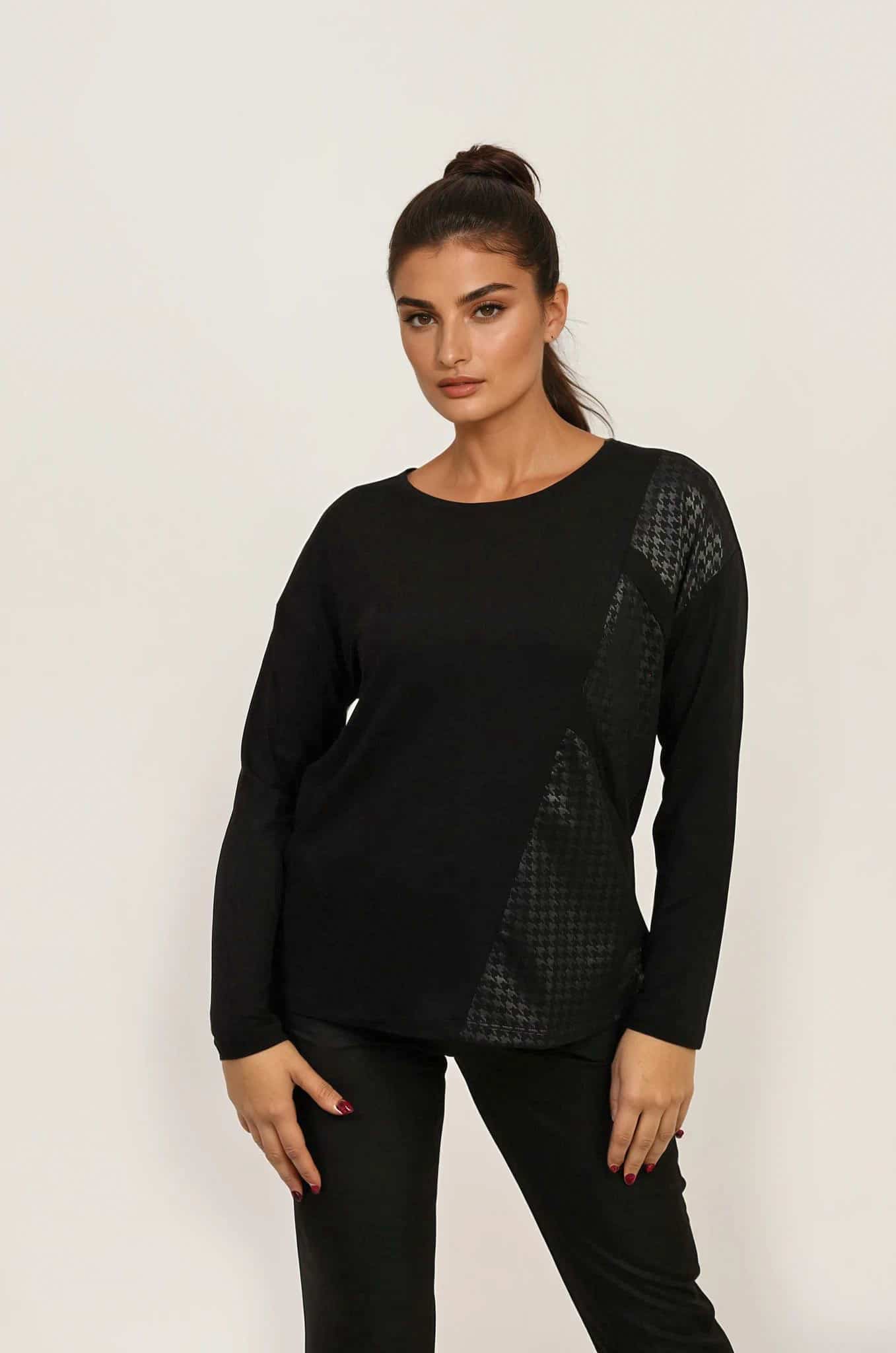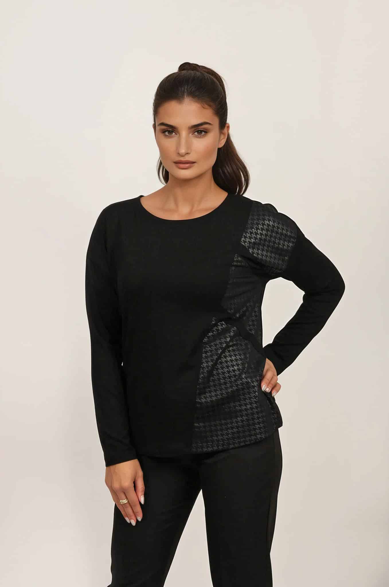 Elegantna bluza modernog dizajna osmišljena je za žene koje žele sofisticiran, ali nenametljiv izgled u svakodnevnim i poslovnim kombinacijama. Minimalistička silueta upotpunjena je asimetričnim dekorativnim panelom sa suptilnim teksturnim uzorkom, koji modelu daje dubinu i vizuelni akcenat bez narušavanja elegancije.
