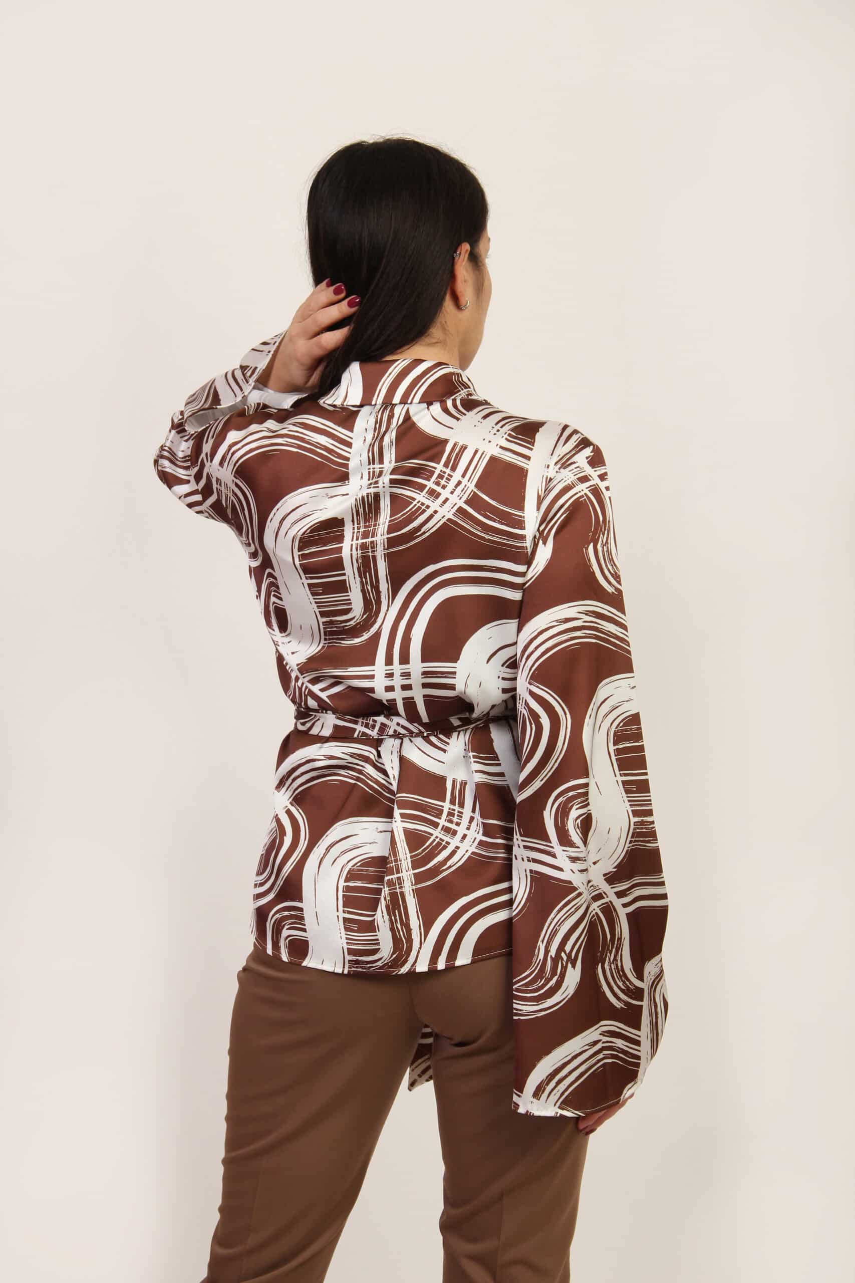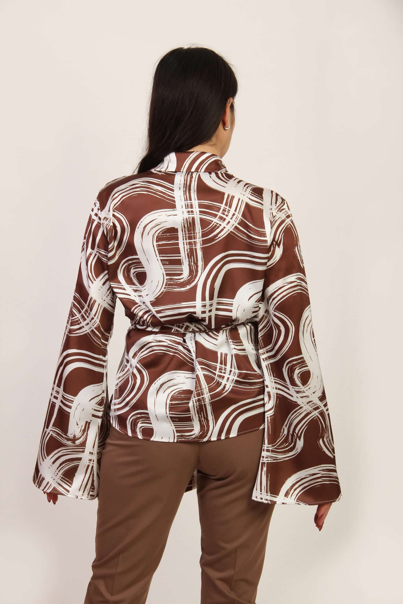 Ovaj model spaja mekanu, prijatnu tkaninu, efektan apstraktni print i pažljivo krojen strukirani pojas koji naglašava figuru i dodaje ženstvenu dinamiku stajlingu.Široki rukavi donose dozu luksuza i fluidnosti, dok klasična kragna čini ovu bluzu idealnim izborom za kancelariju, svečane prilike ili urbano dnevno izdanje.Savršen par uz pantalone visokog struka, suknje olovka kroja ili elegantne komplet-kombinacije.