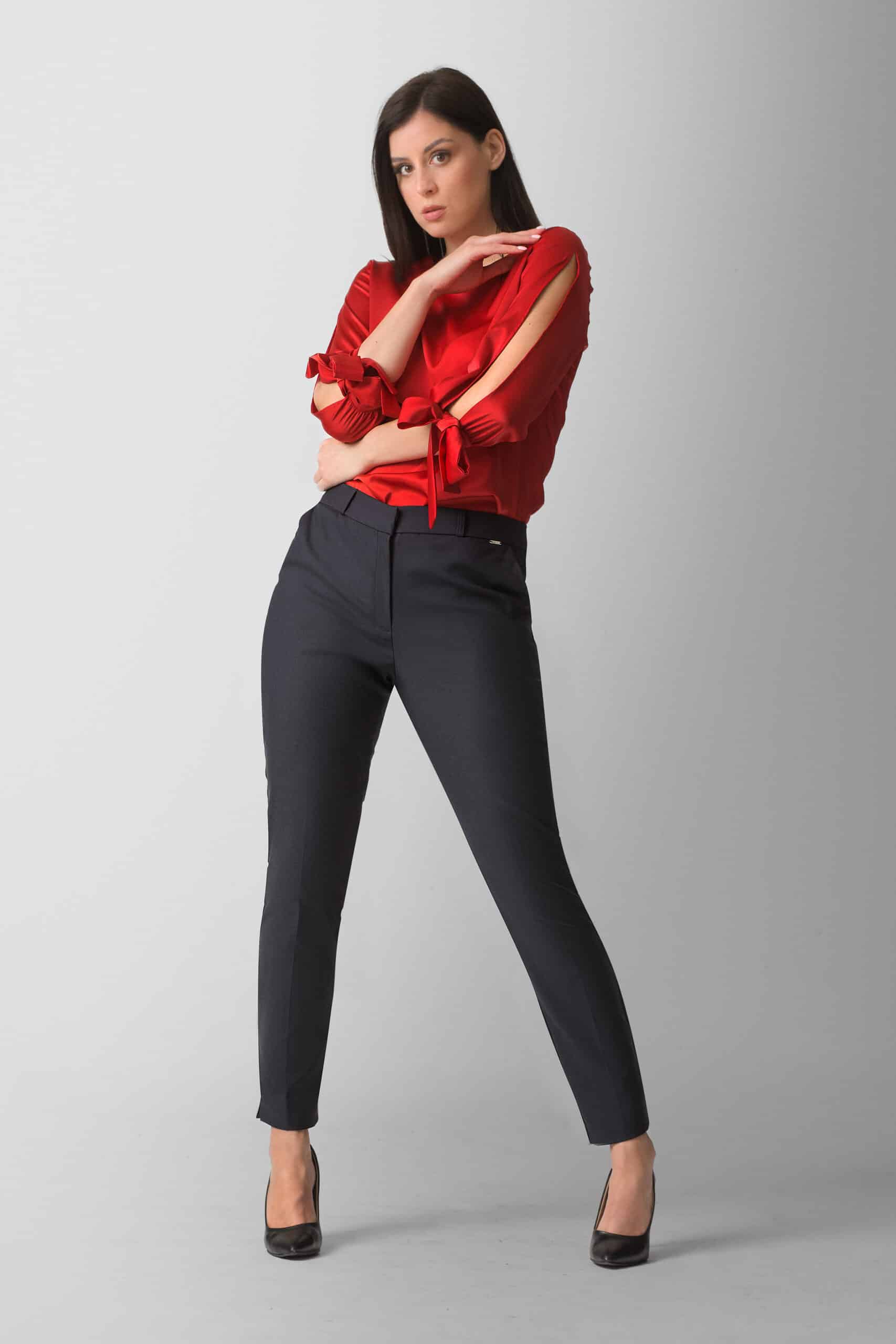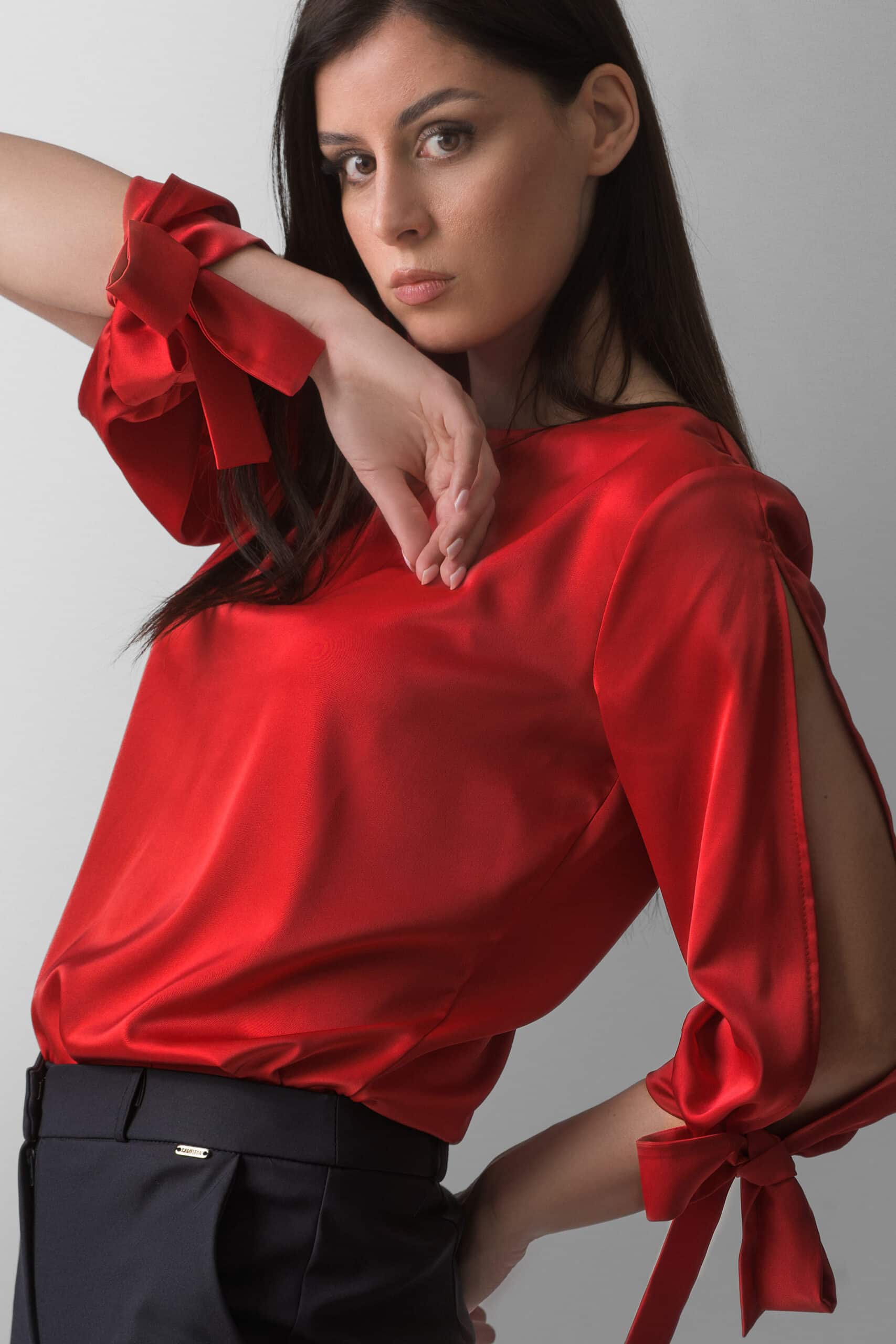 Izrađena od lagane i nežne tkanine sa diskretnim sjajem, bluza pruža udobnost i elegantan izgled tokom celog dana. Rukavi srednje dužine sa mašnama čine je idealnim izborom za poslovne kombinacije, večernje izlaske ili posebne prilike, dok intenzivna crvena nijansa daje dozu samopouzdanja svakom outfitu.