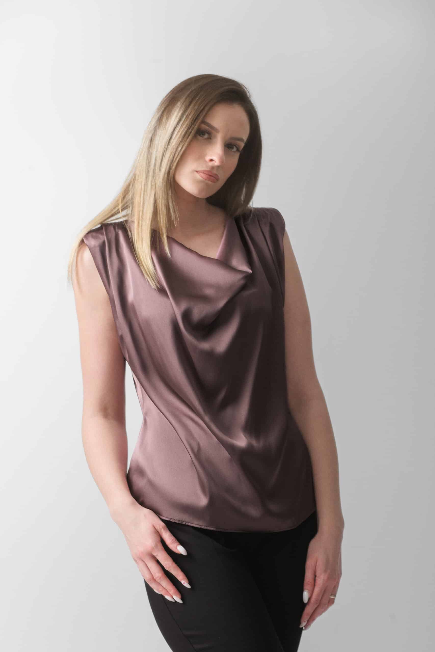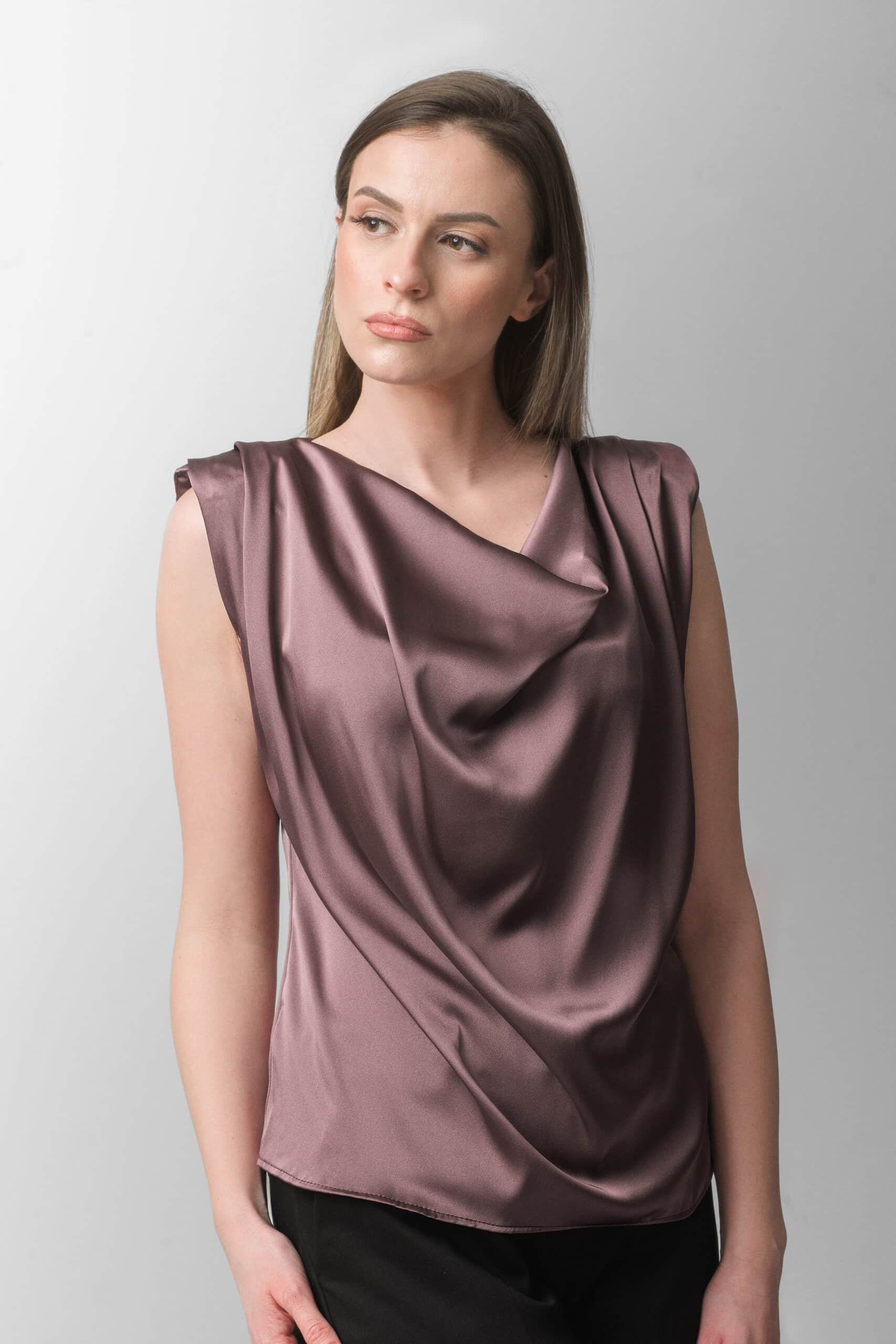 Sofisticirana ženska satenska bluza sa elegantnim drapiranim izrezom donosi dozu luksuza u svakodnevni stil. Mekani, lepršavi materijal nežno prati liniju tela i stvara fluidan, ženstven izgled, dok minimalistički kroj bez rukava naglašava modernu eleganciju.