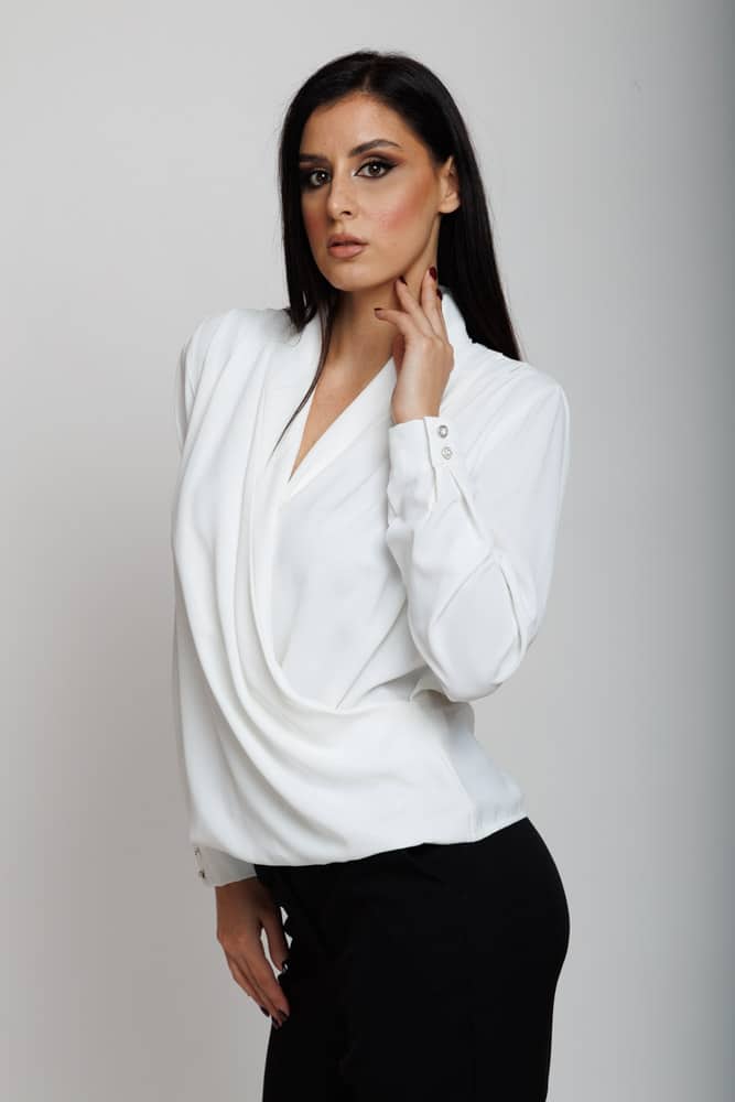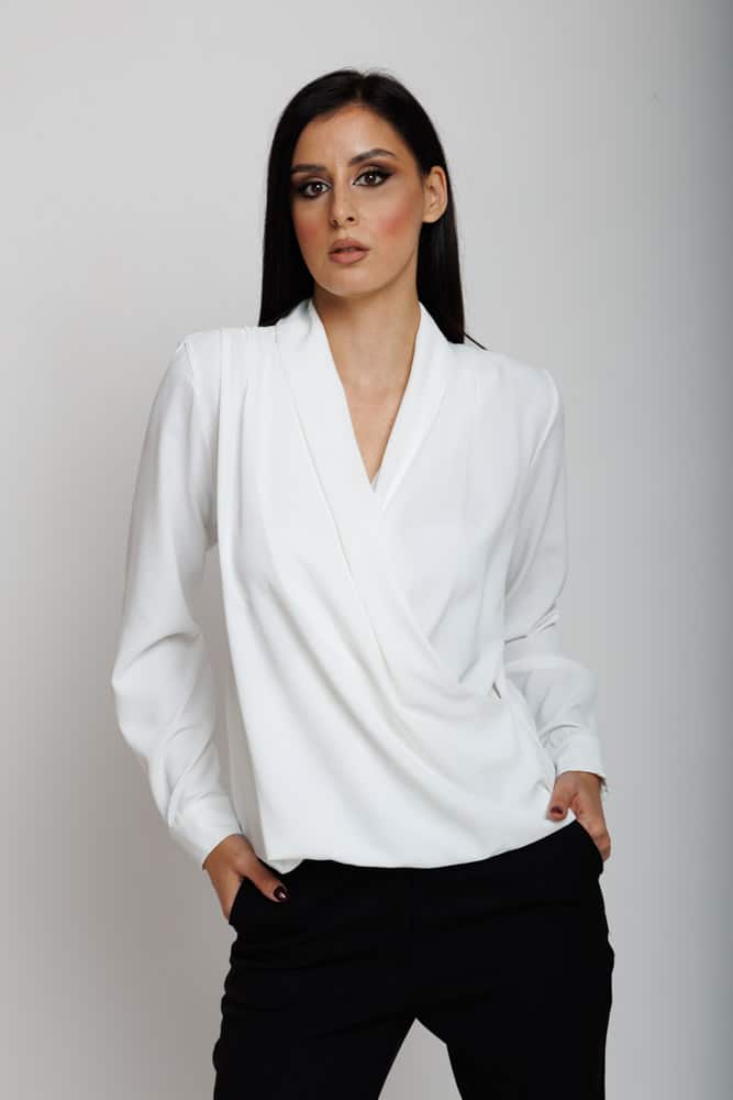 Buza nije samo modni izbor – to je izraz samopouzdanja, elegancije i savremenog stava svake žene.Bluza sa preklopom predstavlja suštinu profinjene jednostavnosti. Dizajnirana u klasičnim nijansama bele i crne, ističe eleganciju kroz čiste linije, V-izrez i diskretne dugmiće na rukavima.