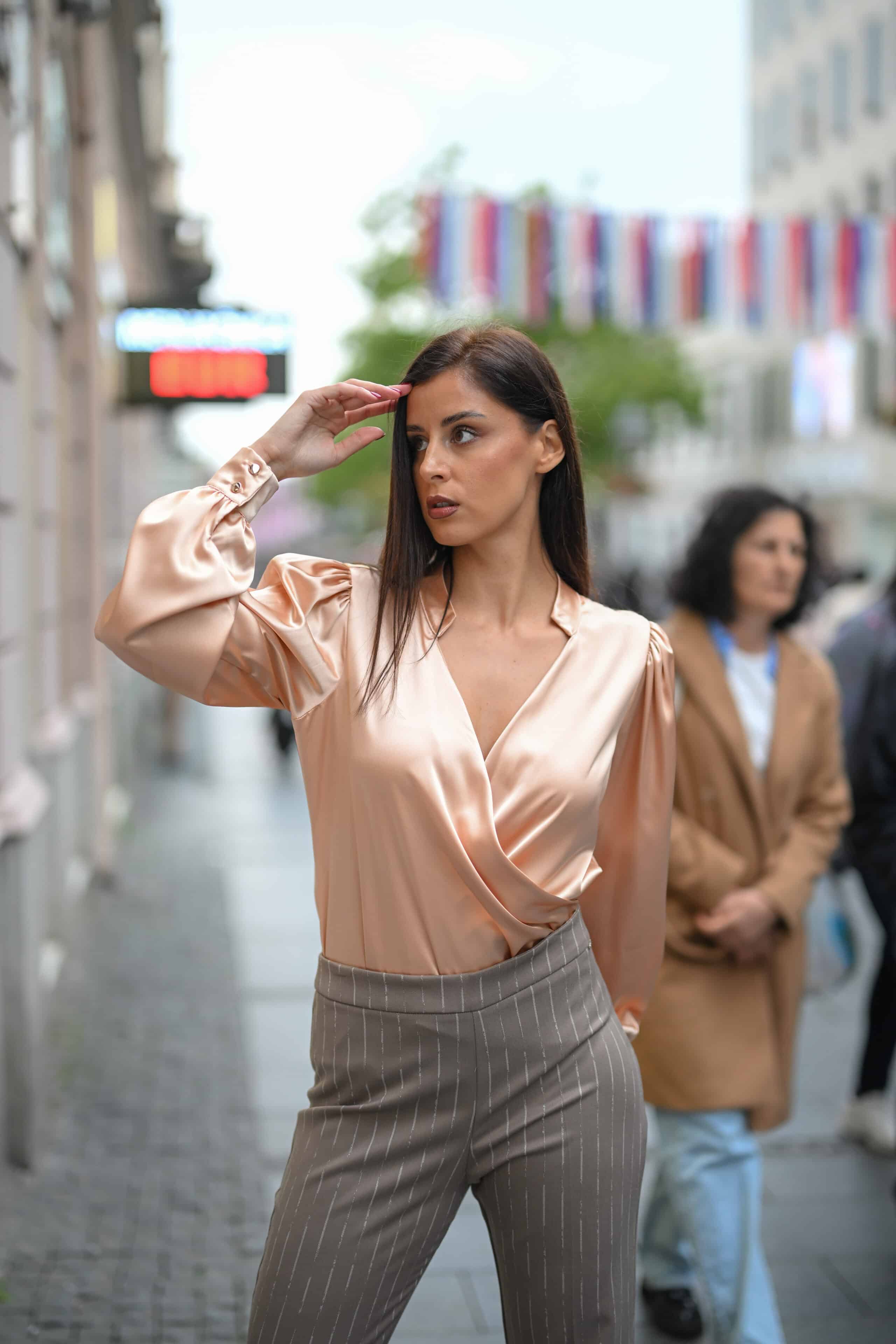 Komad koji spaja eleganciju, udobnost i moderan izraz. Satenska bluza u boji šampanjca odiše luksuzom i sofisticiranošću. Preklopni kroj naglašava ženstvenost, dok meki sjaj satena reflektuje svetlost pri svakom pokretu, dodajući notu glamura. Dugi rukavi sa laganim volumenom i nežno definisana ramena daju elegantnu formu, a materijal prijatno klizi po koži, pružajući osećaj udobnosti.