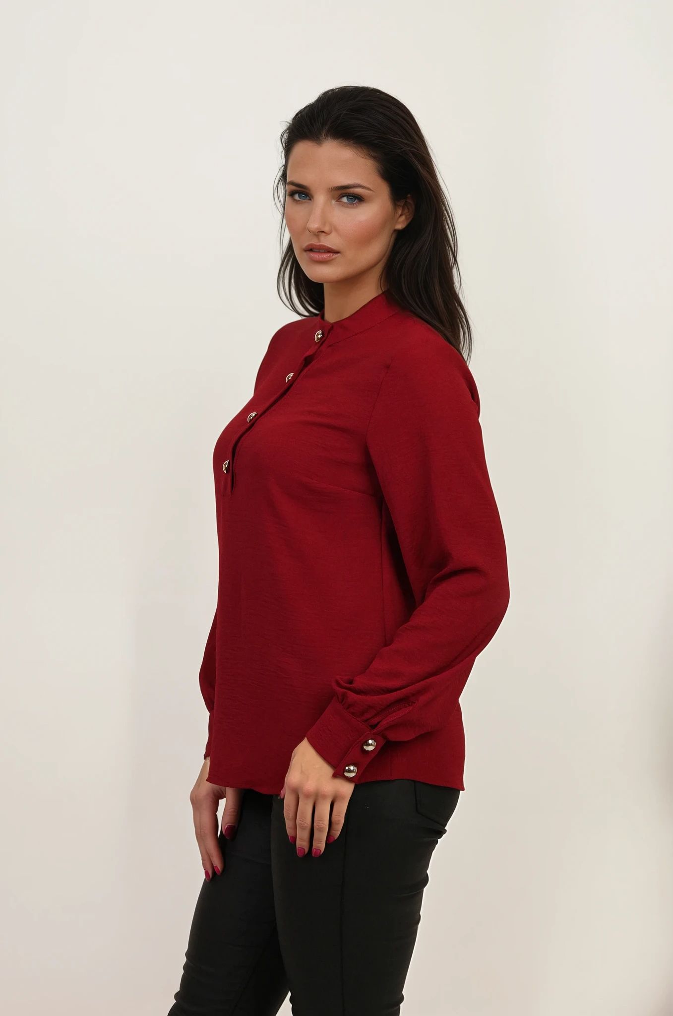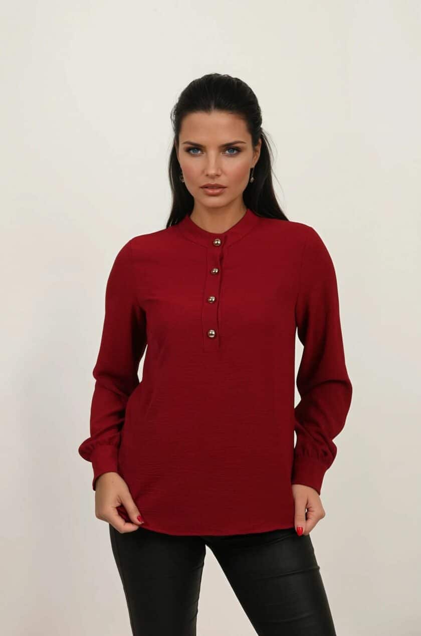 Bluza koja je dizajnirana za žene koje žele eleganciju, toplinu i udobnost u isto vreme. Izrađena je od prijatne, meke i nežno teksturisane tkanine koja se savršeno prilagođava telu bez osećaja težine. Bordo dugmad u zlatnom finišu daju sofisticiranu notu i podižu svaki outfit — od poslovnog, preko casuala, do večernjeg stila.