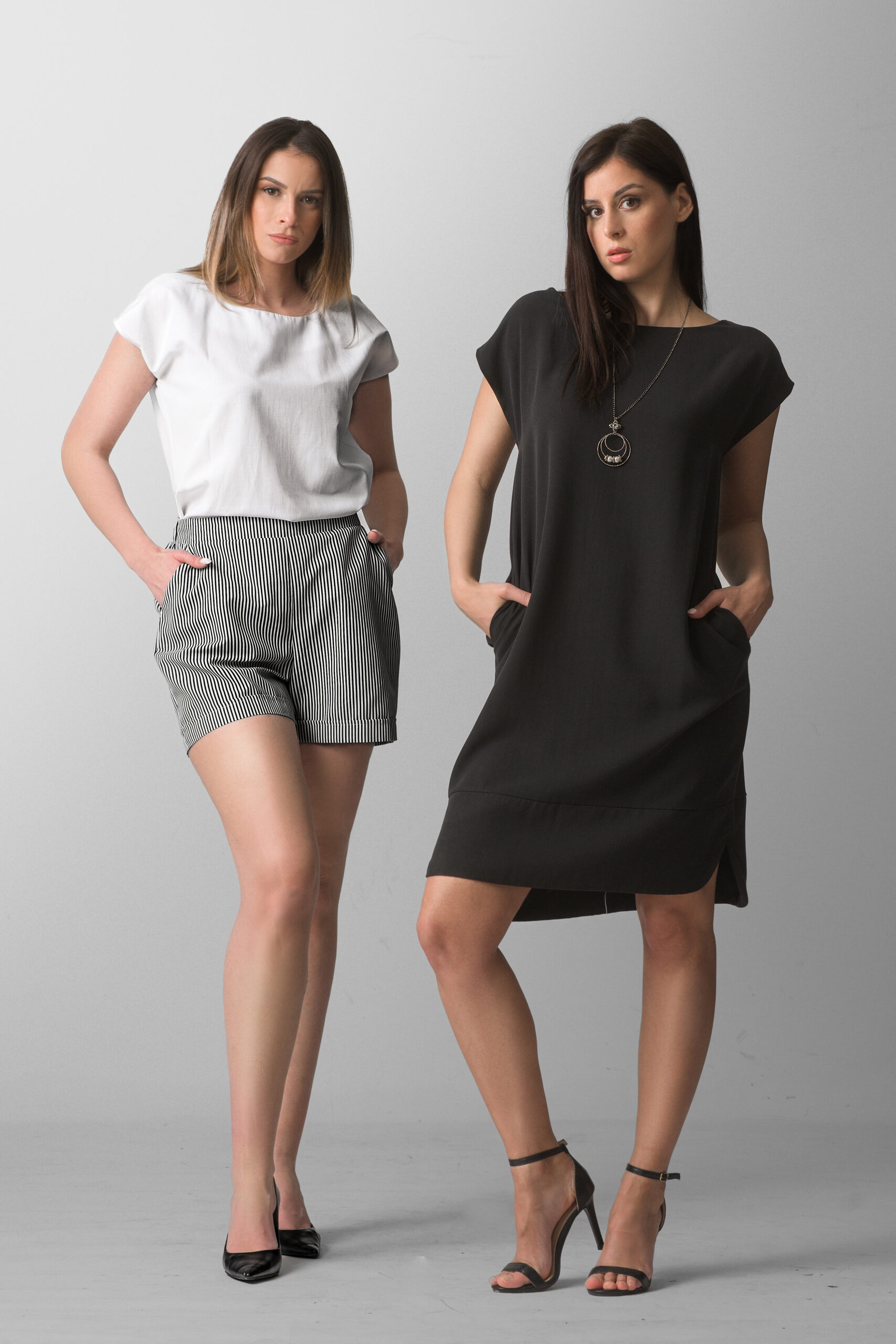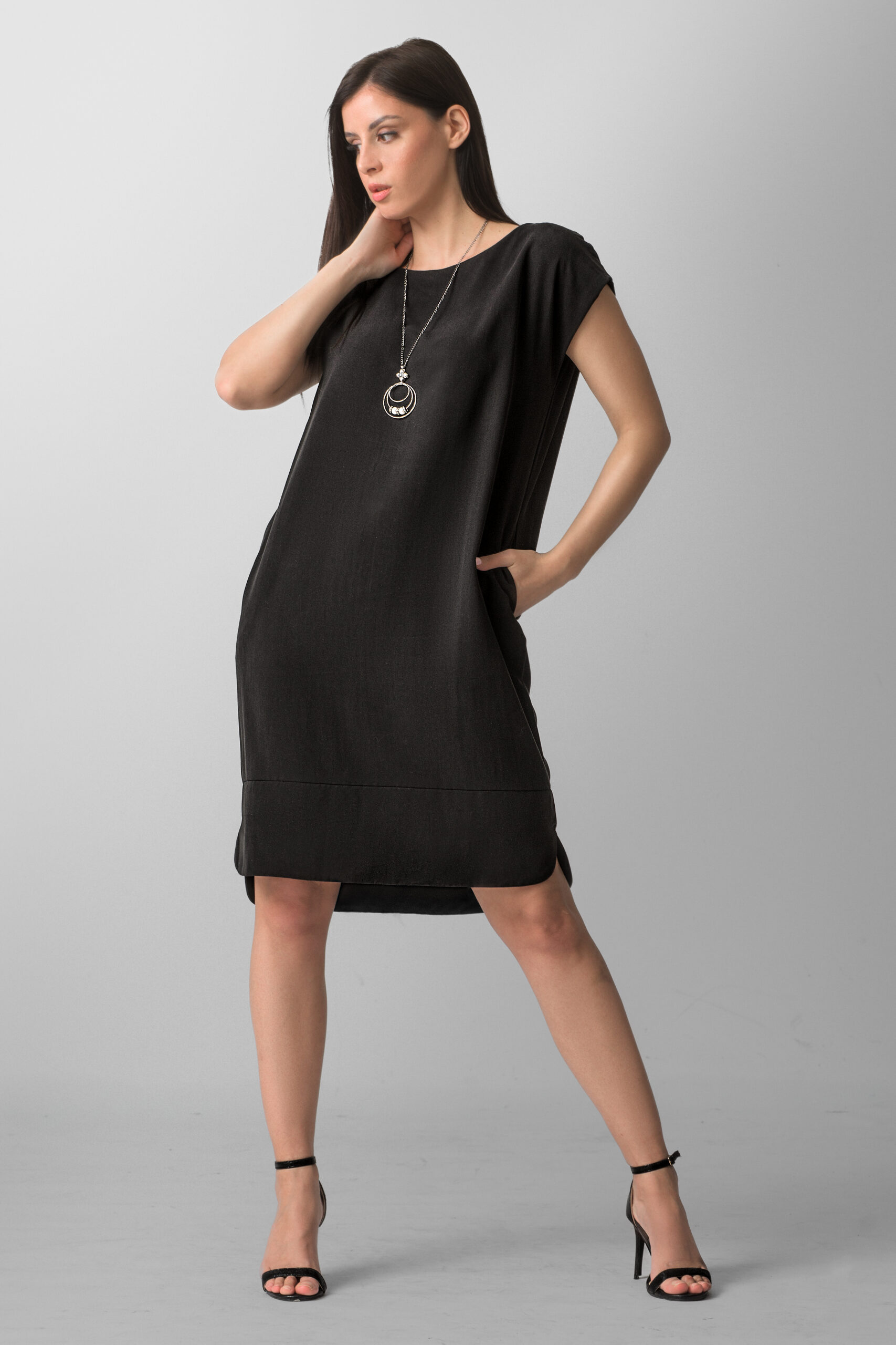 Minimalistička crna haljina modernog kroja predstavlja savršen spoj elegancije i svakodnevne udobnosti. Ležeran, blago A kroj omogućava slobodu pokreta, dok diskretni detalji poput kratkih rukava i praktičnih džepova daju modelu savremeni karakter. Čista linija dizajna naglašava sofisticiran stil, čineći ovu haljinu idealnim izborom za poslovne prilike, gradske kombinacije ili večernji izlazak uz modne aksesoare.