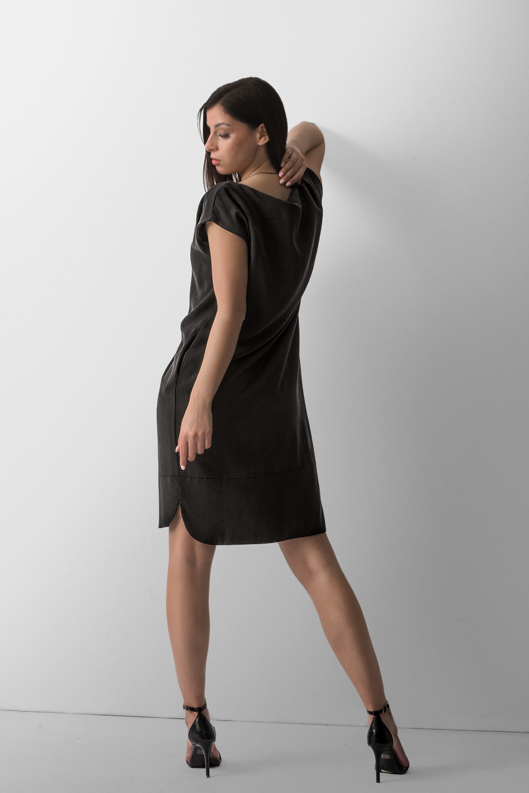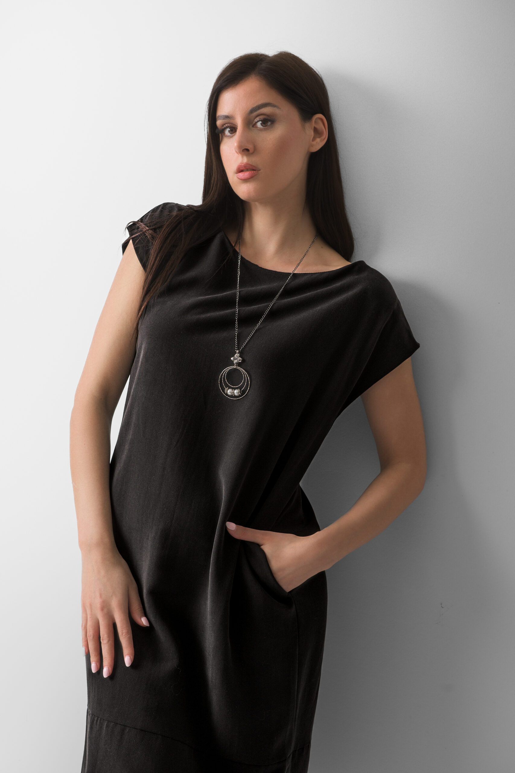 Neutralna crna boja pruža beskrajne mogućnosti stilizovanja – nosiva je uz visoke potpetice za elegantan izgled ili uz ravnu obuću za opuštenu dnevnu varijantu. Zahvaljujući jednostavnom kroju i kvalitetnom materijalu, haljina je praktičan i dugotrajan komad garderobe za žene koje vole modernu klasiku.