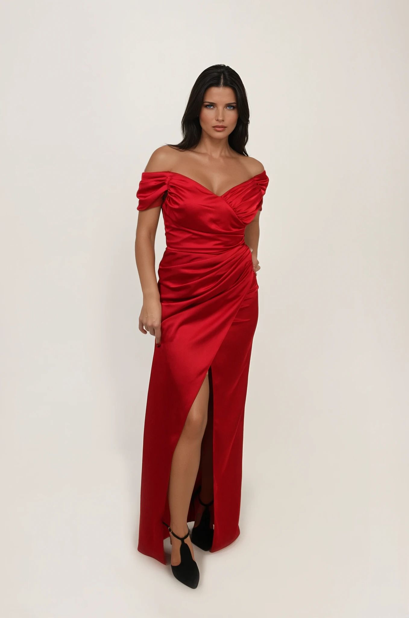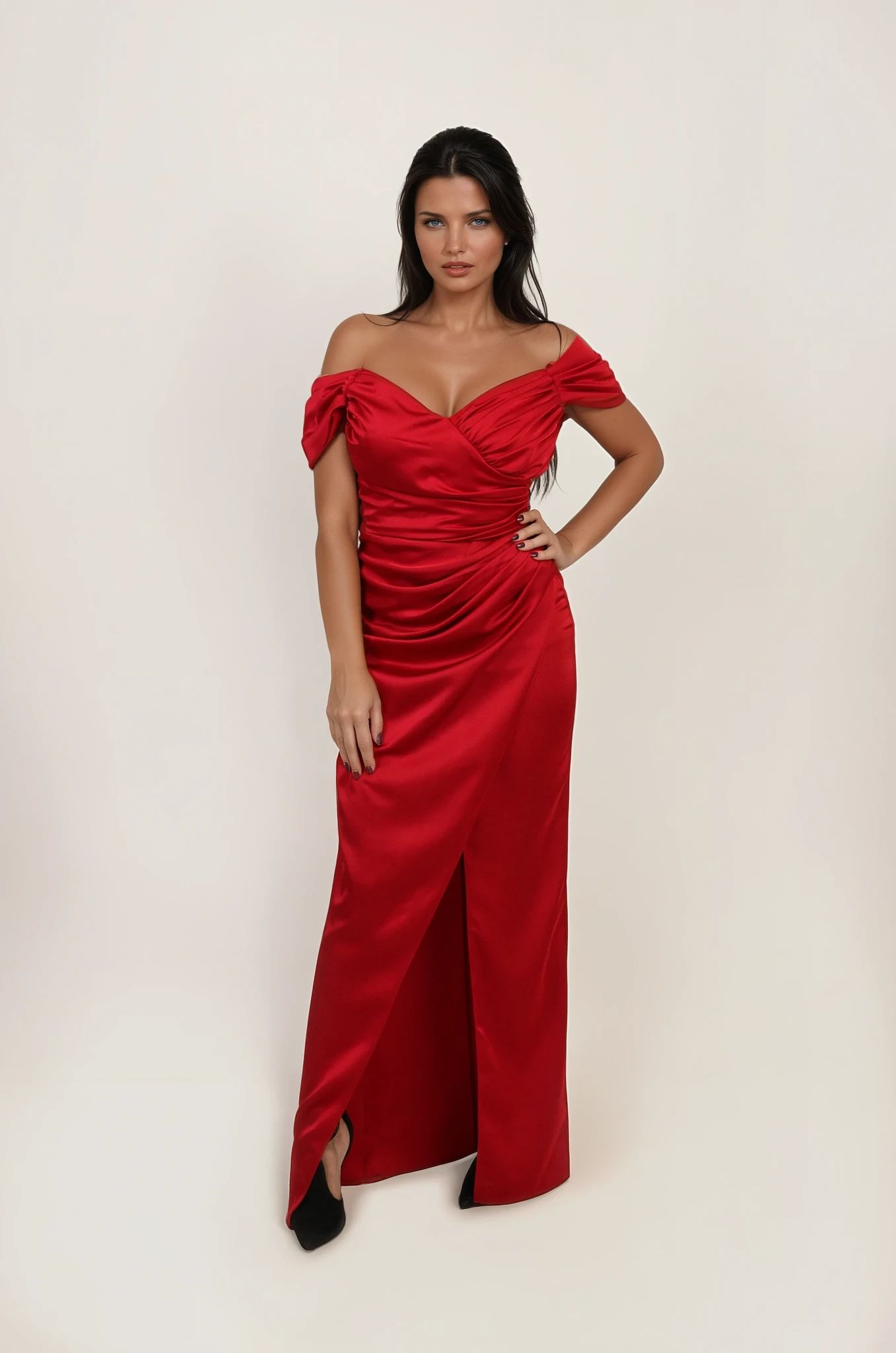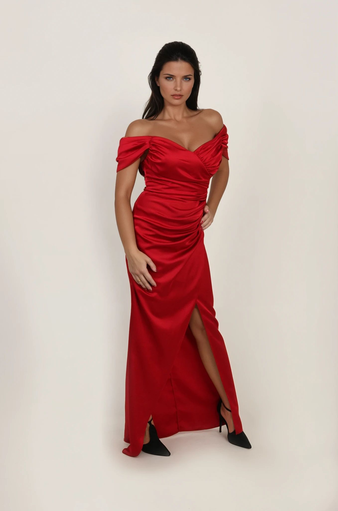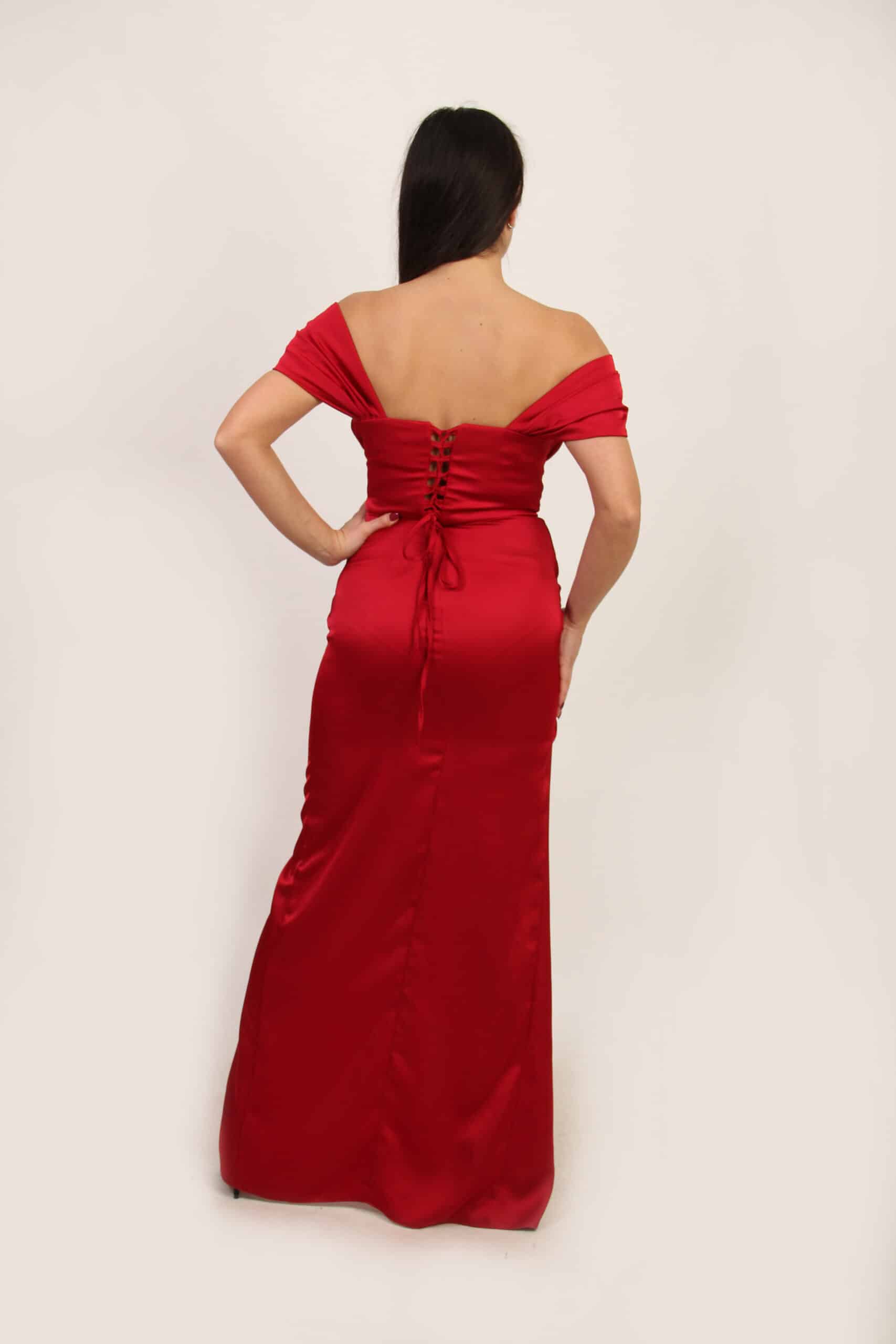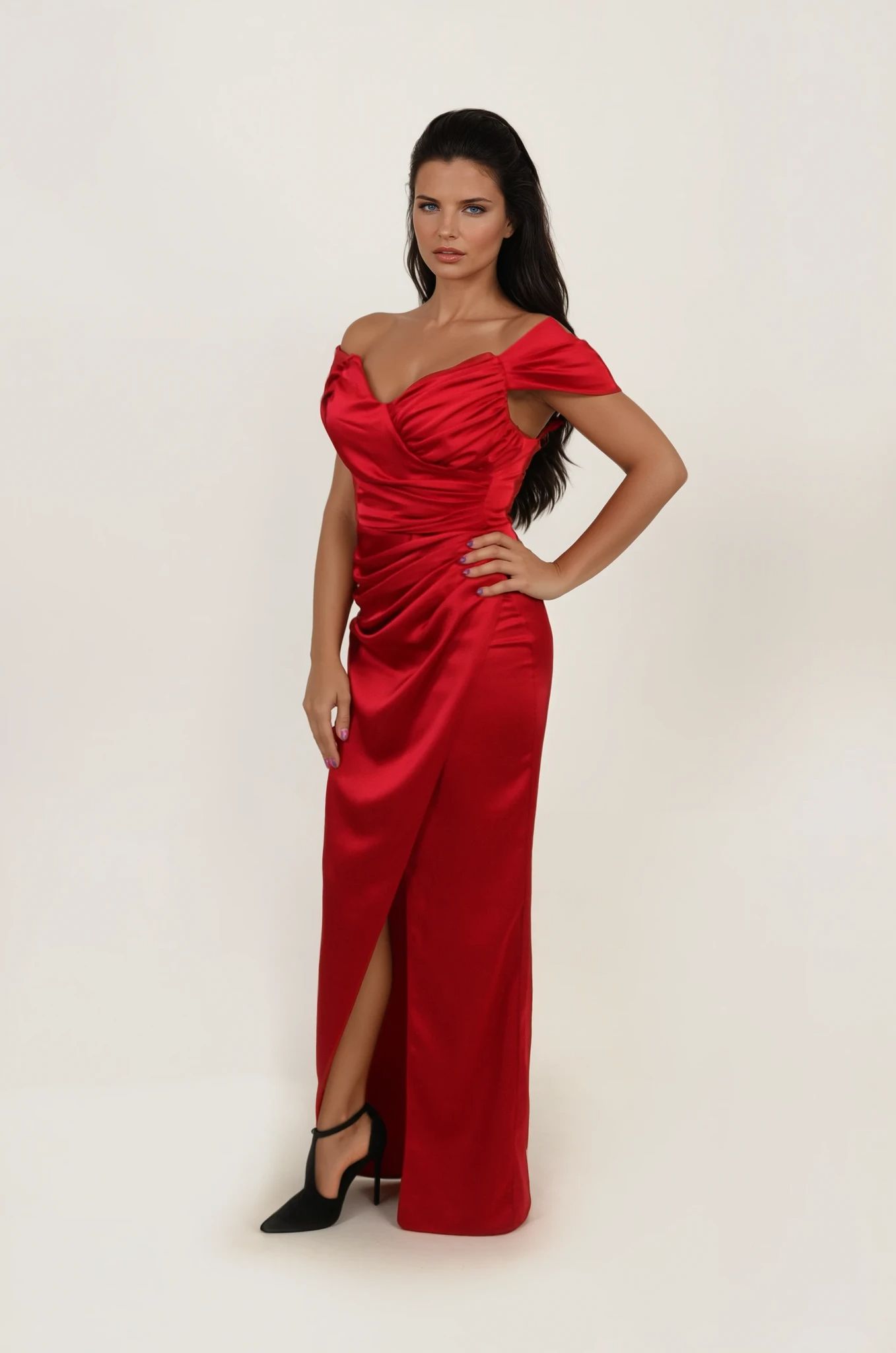 Kroj sa romantično spuštenim ramenima i nežno formiranim naborima kreira sofisticiran dekolte, dok struk naglašava siluetu i oblikuje liniju tela. Drapirani prednji deo dodatno vizuelno sužava figuru, a visoki prorez donosi dinamiku, lakoću pokreta i diskretan, ali zavodljiv akcenat.