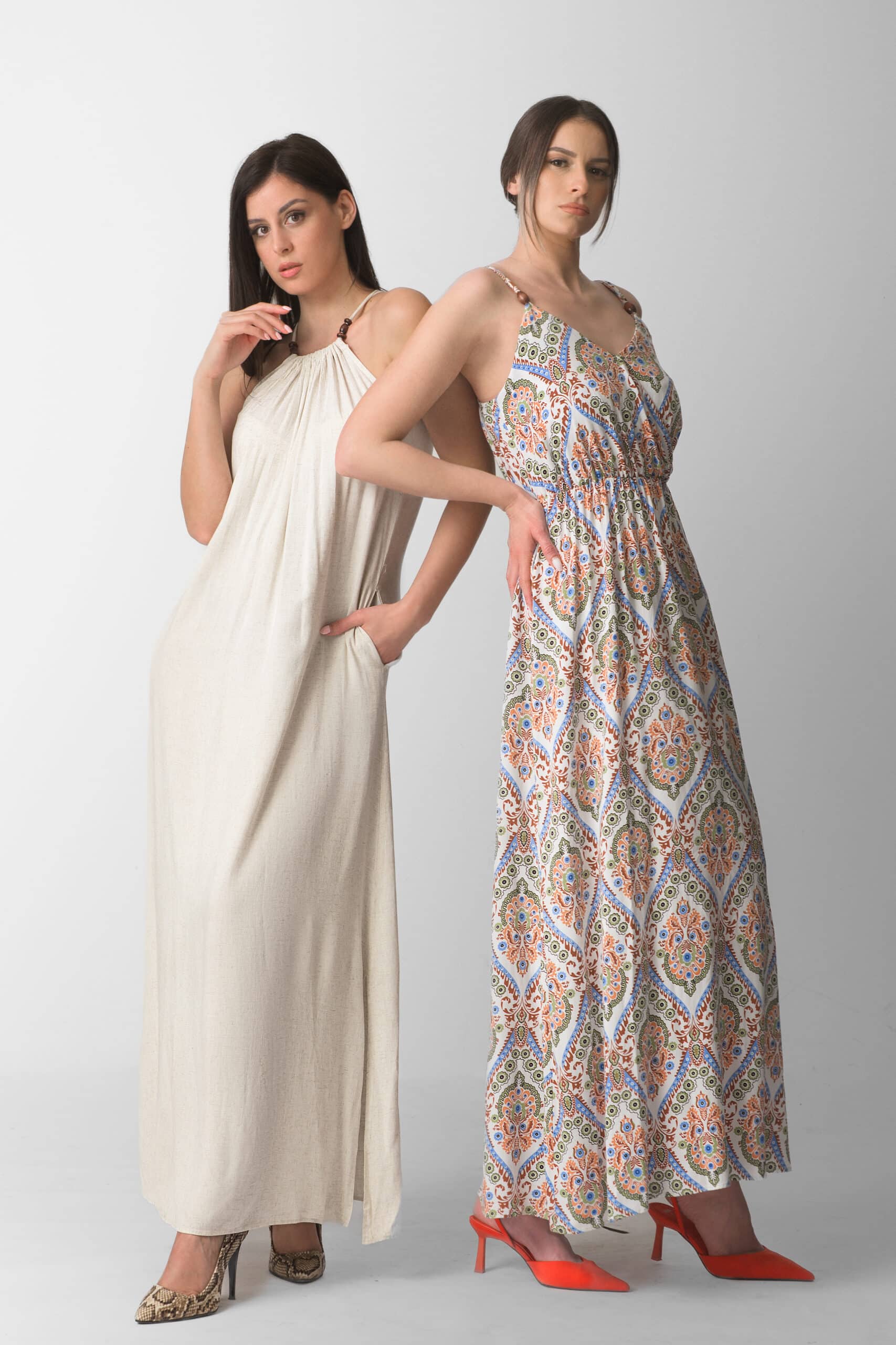 Duga ženska haljina sa upečatljivim dezenom donosi savršen spoj boho elegancije i letnje ležernosti. Lagani materijal i lepršav kroj omogućavaju slobodno kretanje i prijatan osećaj tokom celog dana, dok tanke bretele i V izrez dodatno naglašavaju ženstvenu siluetu. Struk sa blagim nabiranjem stvara elegantnu liniju i daje haljini prirodan pad koji izdužuje figuru.