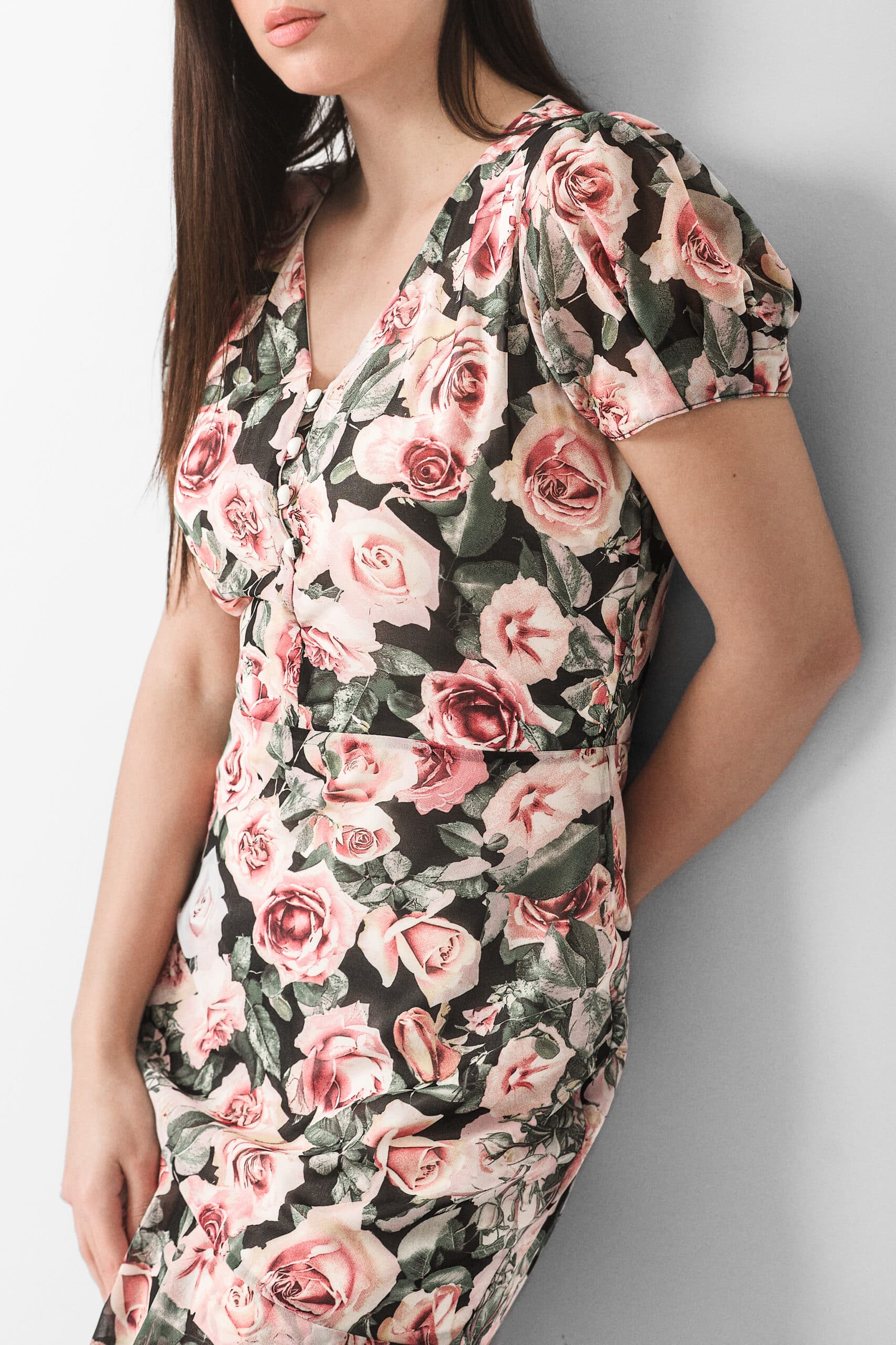 Bogati floralni dezen čini ovu haljinu idealnim izborom za dnevne prilike, poslovne kombinacije ili večernje izlaske. Lako se stilizuje uz sandale, salonke ili baletanke, pa predstavlja svestran komad garderobe za žene koje vole romantičan stil sa modernim detaljima.
