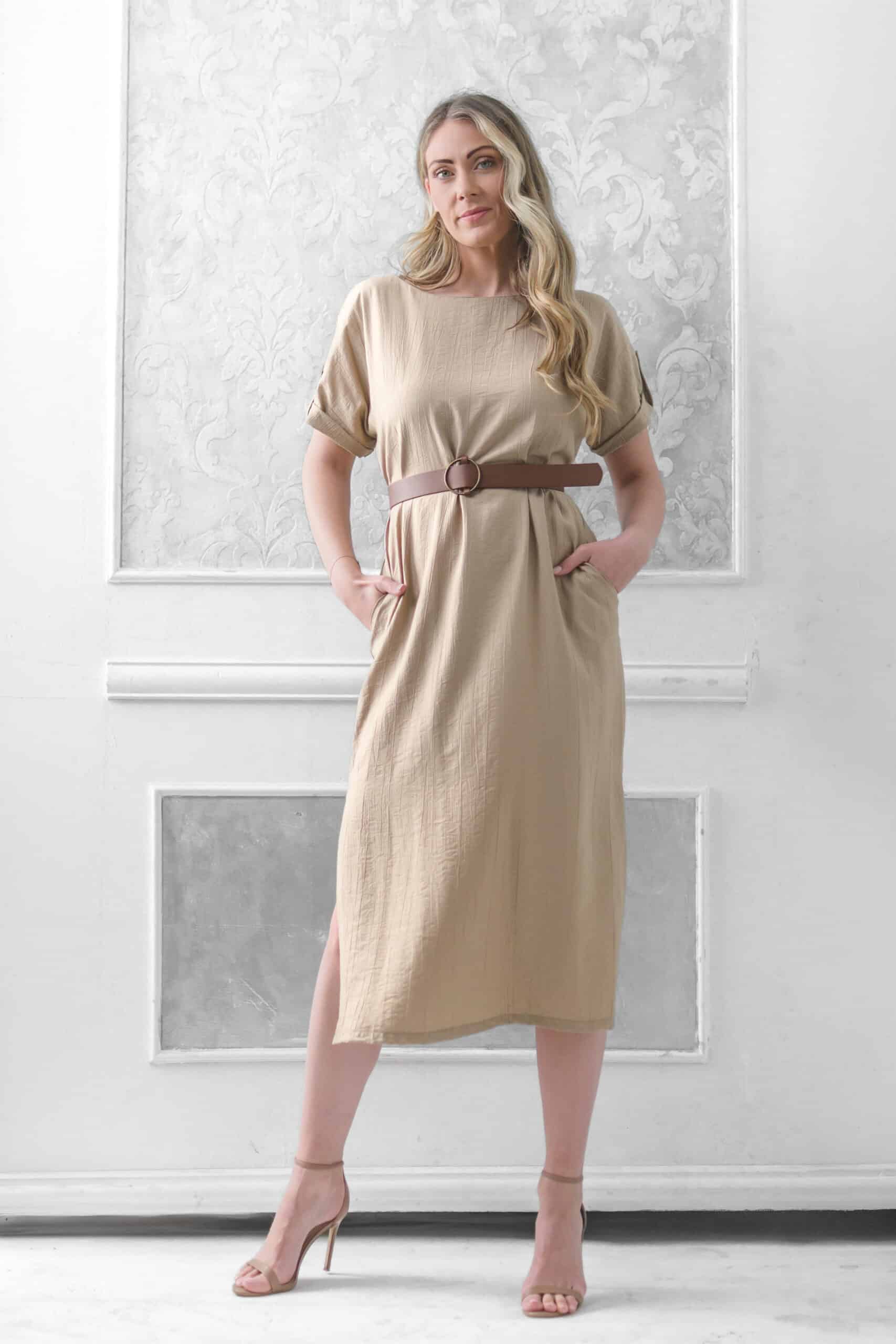 Minimalistička i sofisticirana, ova bež midi haljina osmišljena je za žene koje vole čist dizajn i funkcionalnu eleganciju. Ravna silueta je blago strukirana uz pomoć tankog pojasa koji naglašava liniju tela, dok bočni šlic diskretno dodaje ženstvenost i omogućava lakše kretanje.