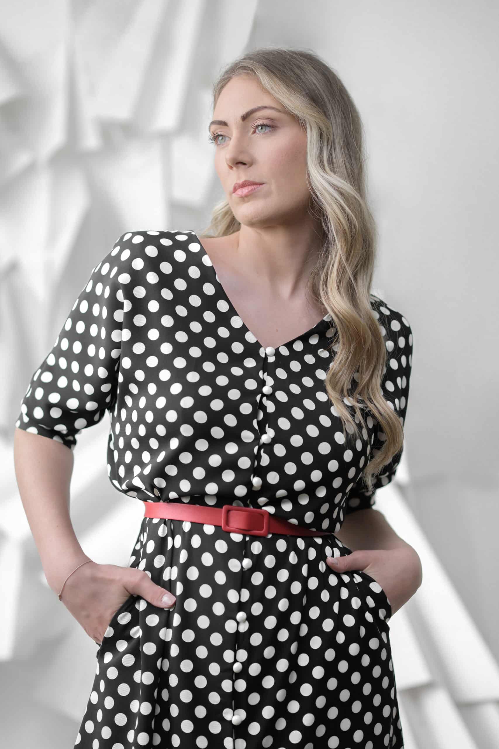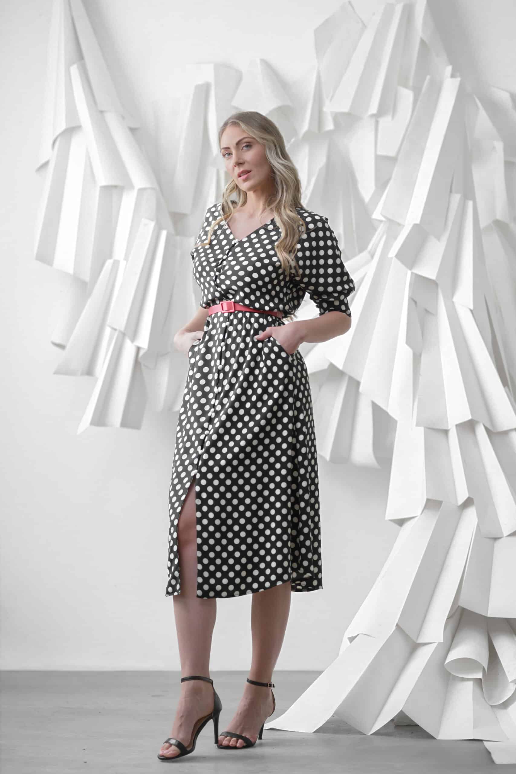 Klasična elegancija sa modernim akcentom – crno-bela midi haljina na tufne donosi prepoznatljiv stil koji nikada ne izlazi iz mode. Ženstvena silueta naglašena je strukom i tankim pojasom koji ističe liniju tela, dok prednje kopčanje dugmadima dodaje praktičnost i sofisticiran izgled.