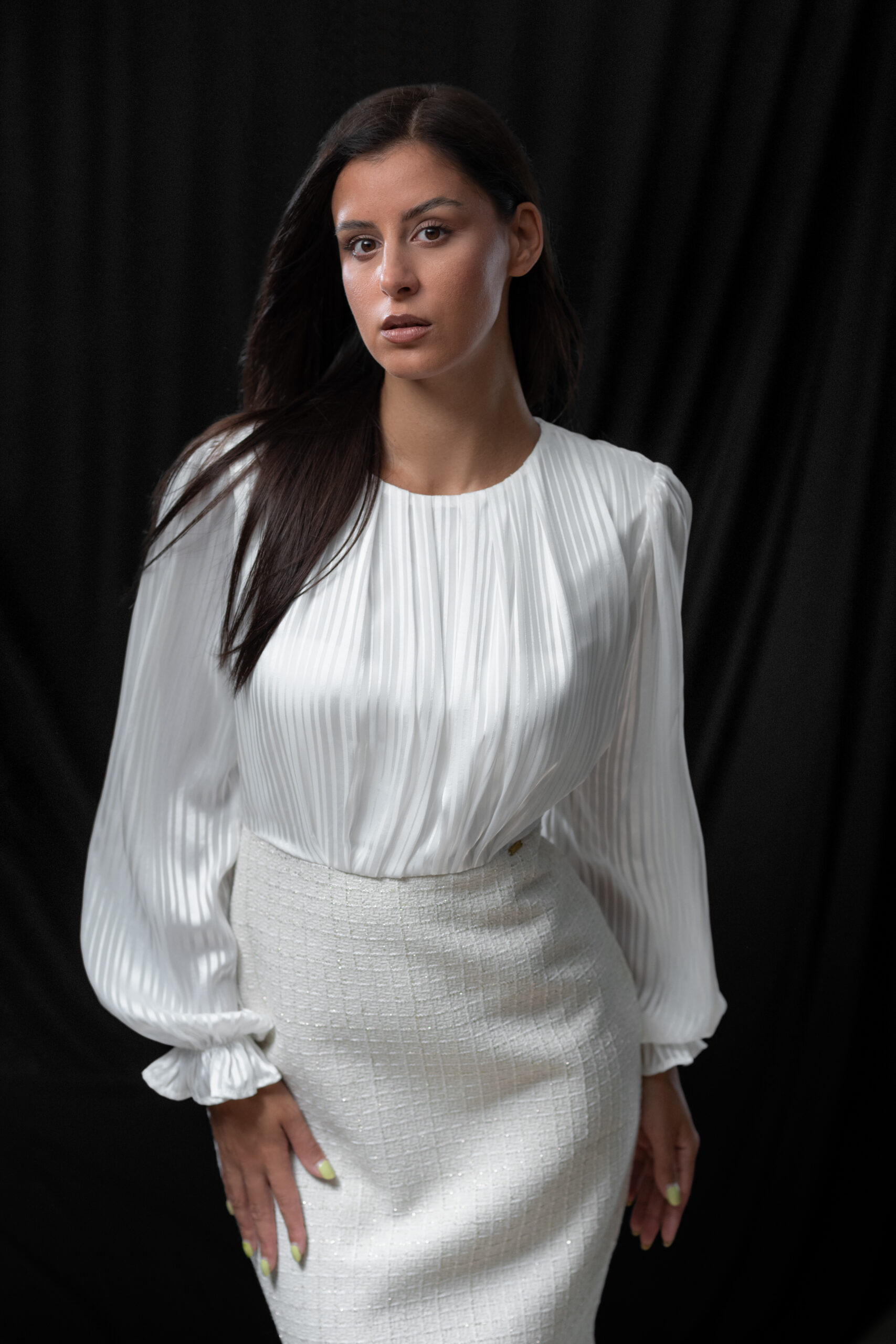 Dugi rukavi i jednostavan kroj naglašavaju minimalističku eleganciju, dok bela boja odiše čistoćom i luksuzom. Idealna je za poslovne prilike, svečane događaje ili dnevne kombinacije sa modernim aksesoarima.
