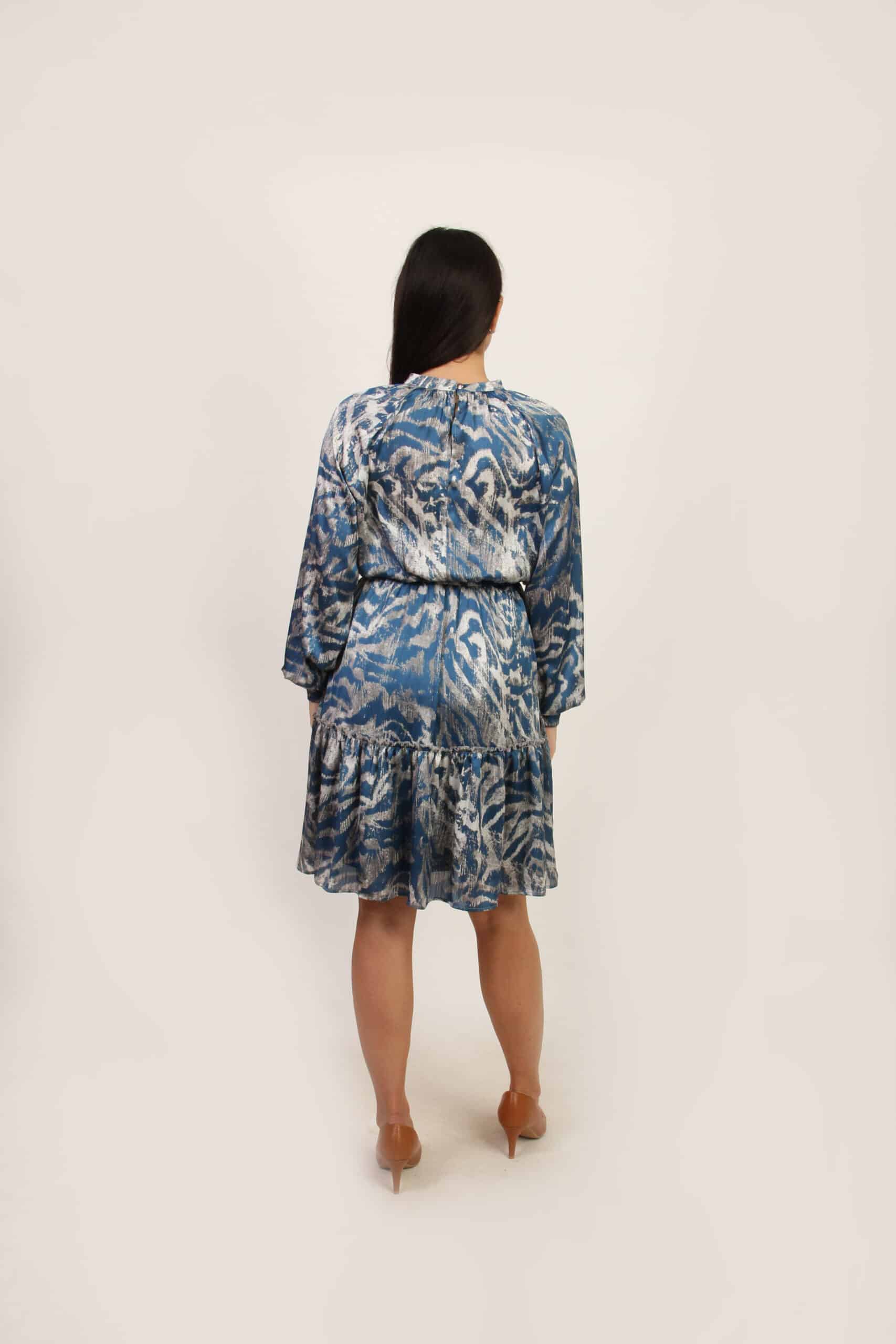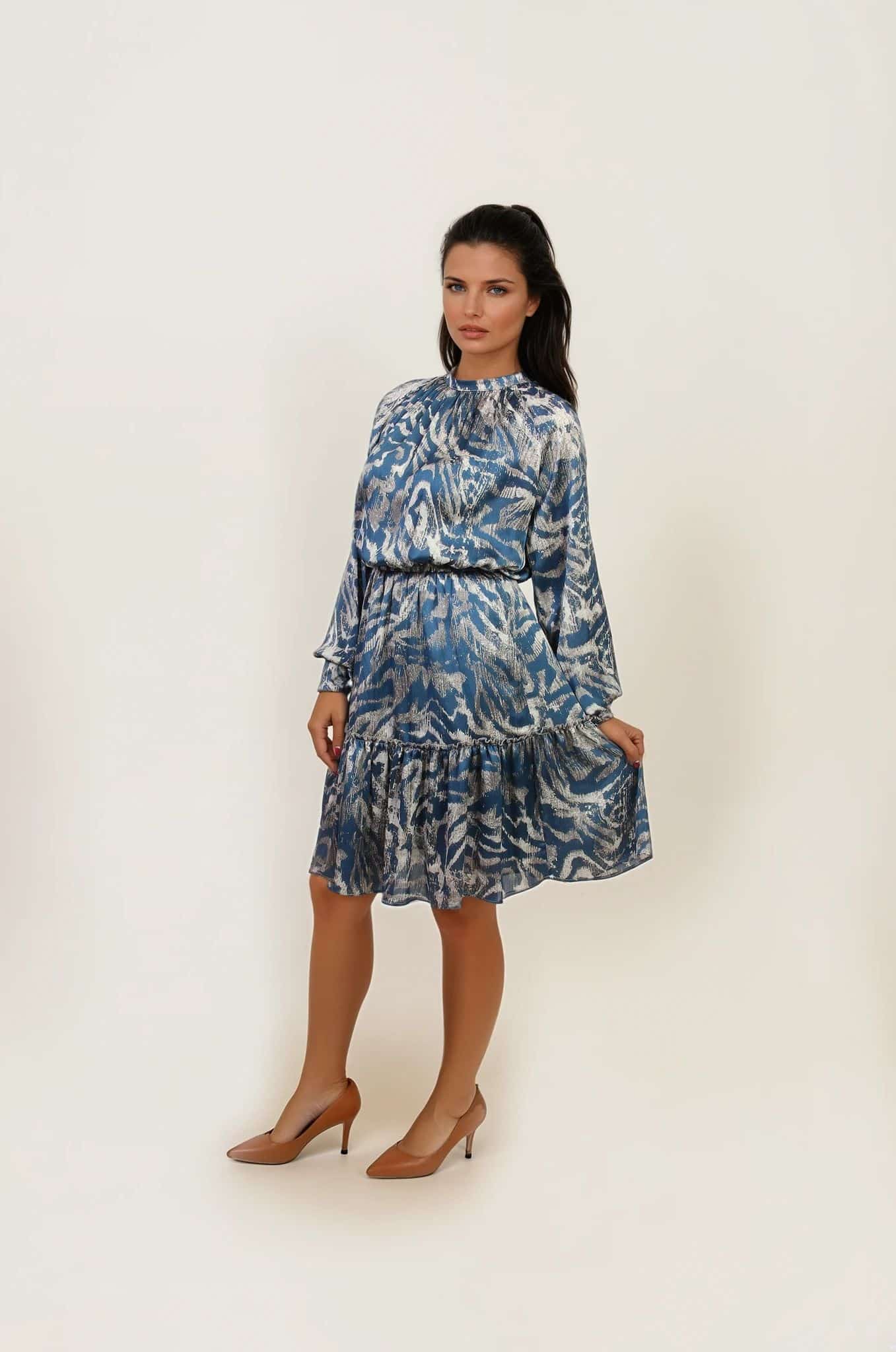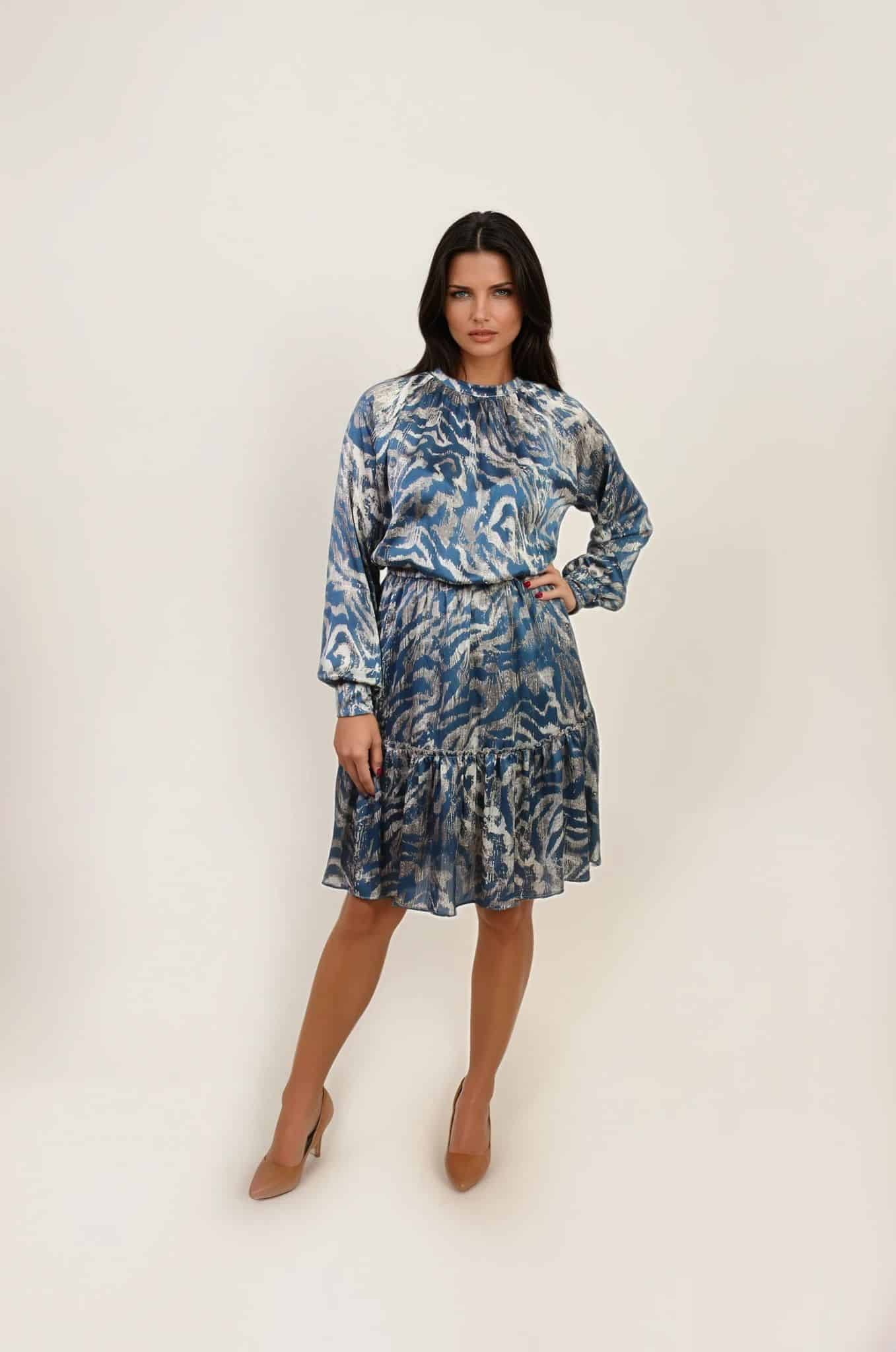 Dugi rukavi i midi dužina čine je pogodnom i za dnevne i za večernje prilike – uz ravne čizme za ležerniji ton ili uz štikle i nakit za sofisticiraniji izgled. Print u zlatno-sivim tonovima daje posebnu toplinu i upečatljiv karakter.