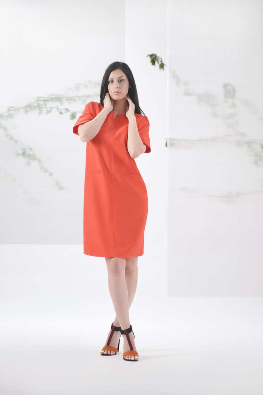 Haljina efektne crvene boje, strukirana. Dužine do kolena, kratkog rukava i okruglim izrezom. Sa zadnje strane se nalaz skriveni rajsferšlus. Haljina je idelana za prolećne dane, nosiva je u gotvo svim prilikama, Upotpunite svoj outfit nekim od naših sakoa iz nove kolekcije.