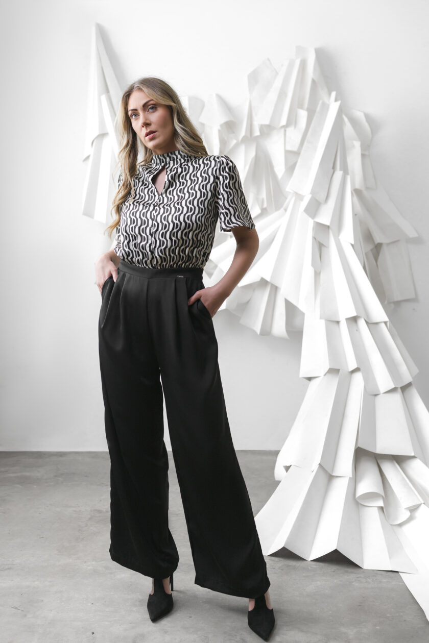Crni elegantni kombinezon širokih nogavica predstavlja savršen spoj modernog minimalizma i bezvremenske sofisticiranosti. Visok struk i ravna linija kroja vizuelno izdužuju figuru, dok široke nogavice daju profinjen i luksuzan izgled.