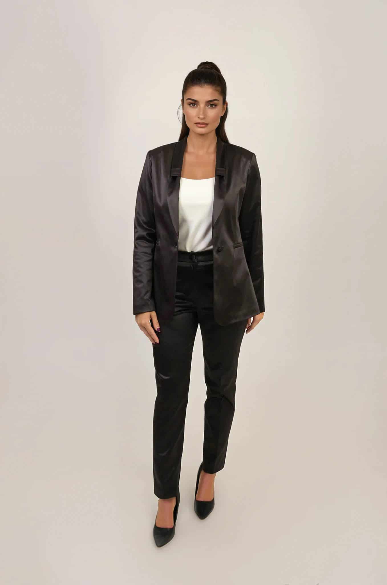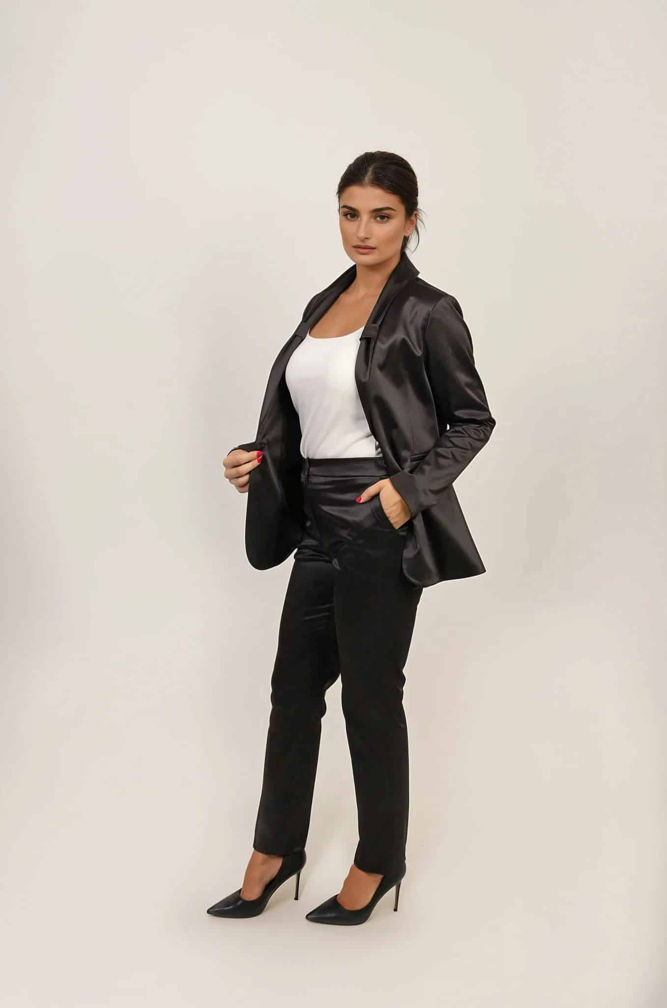 Elegantni ženski komplet sastavljen od modernog sakoa i pantalona donosi savršenu ravnotežu između sofisticiranog poslovnog stila i savremene ženstvenosti. Izrađen od kvalitetne satenske tkanine sa suptilnim sjajem, komplet ostavlja luksuzan utisak i vizuelno podiže svaku kombinaciju.