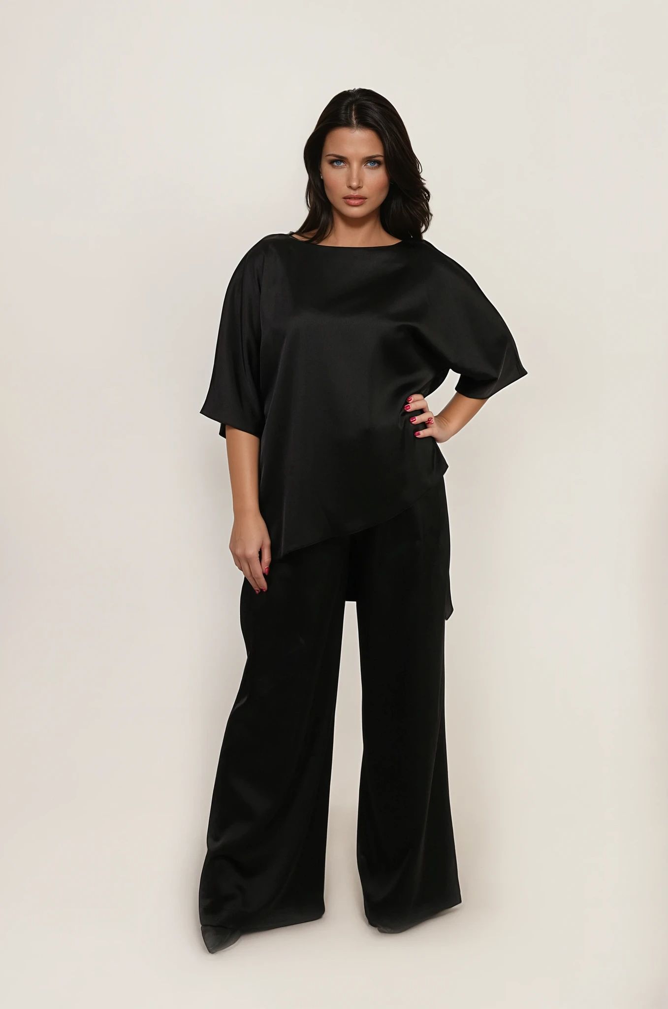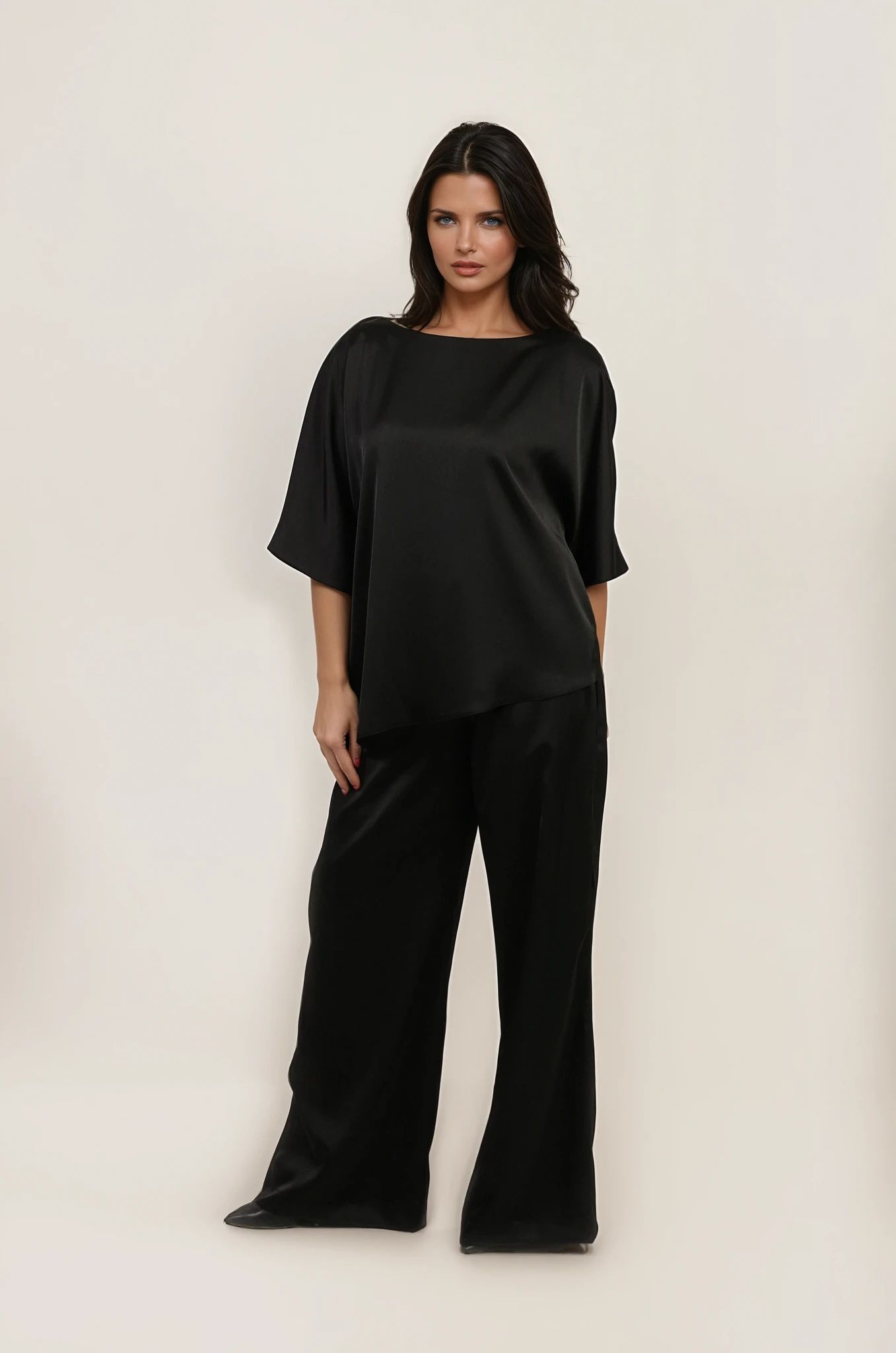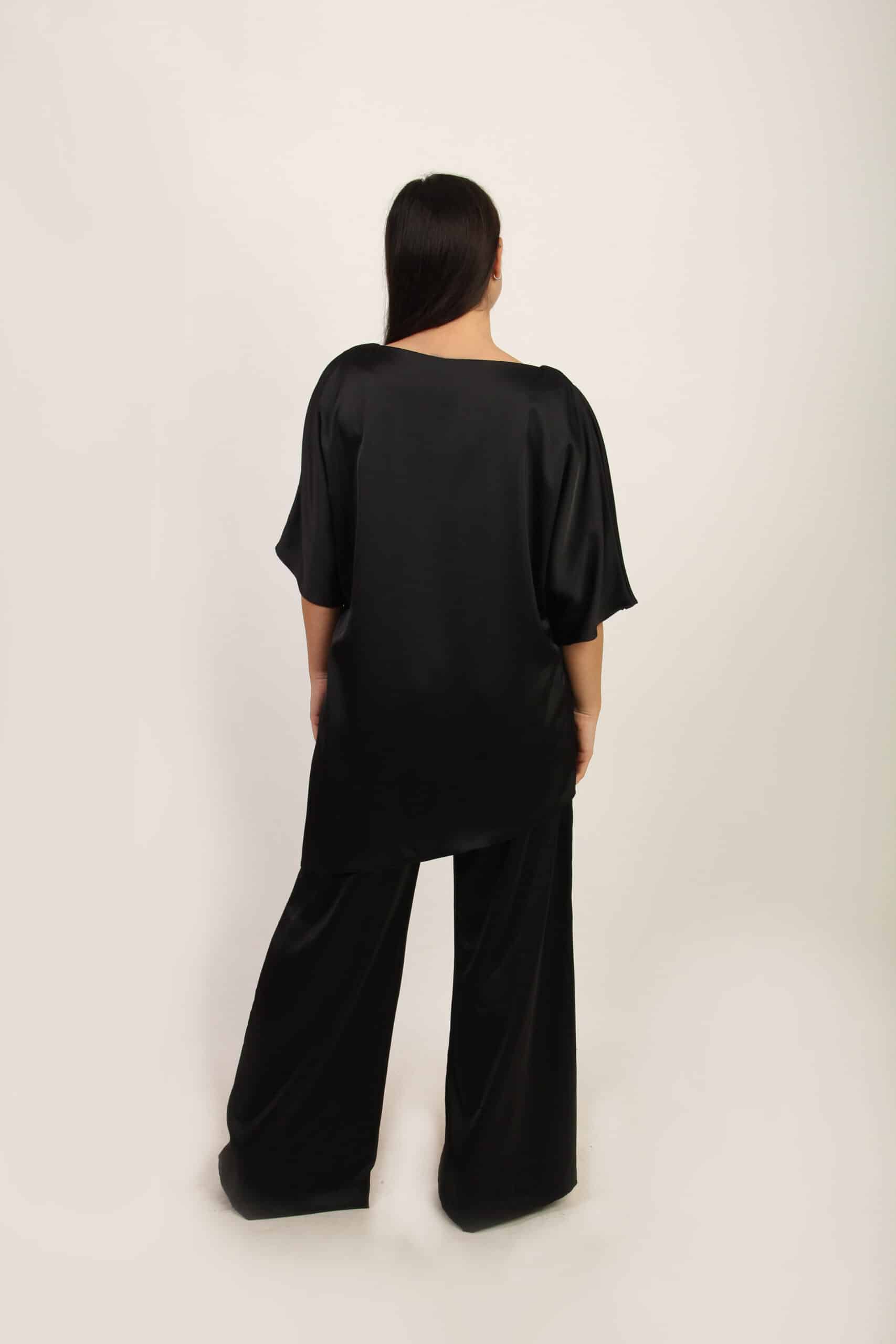 Elegantni crni satenski komplet donosi savršenu ravnotežu sofisticiranosti i udobnosti. Gornji deo krasi lagana, asimetrična tunika sa blagim oversize efektom koja nežno pada preko linije tela, dok široke pantalone stvaraju fluidan, izdužen siluetu i postižu visok nivo elegancije bez napora.