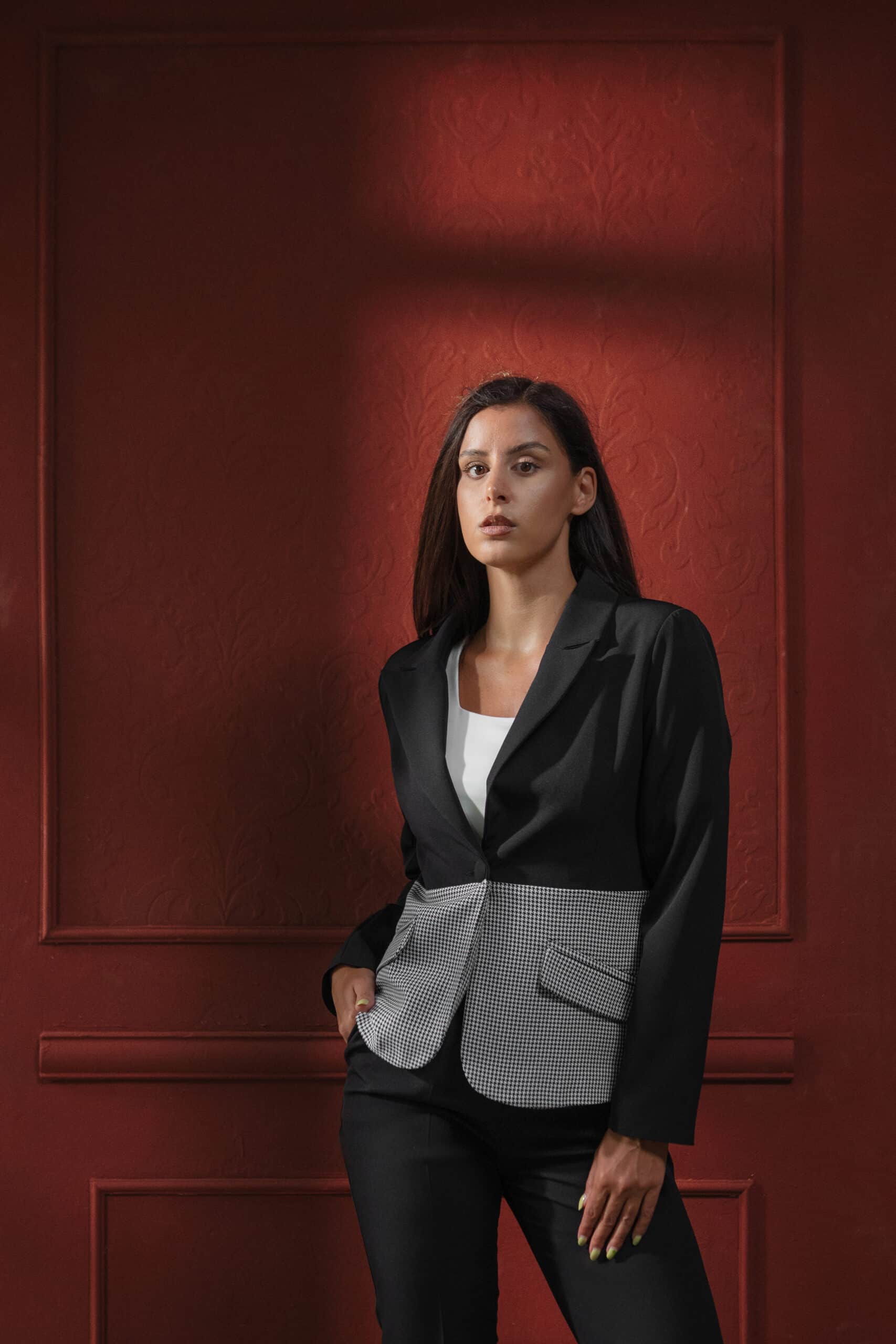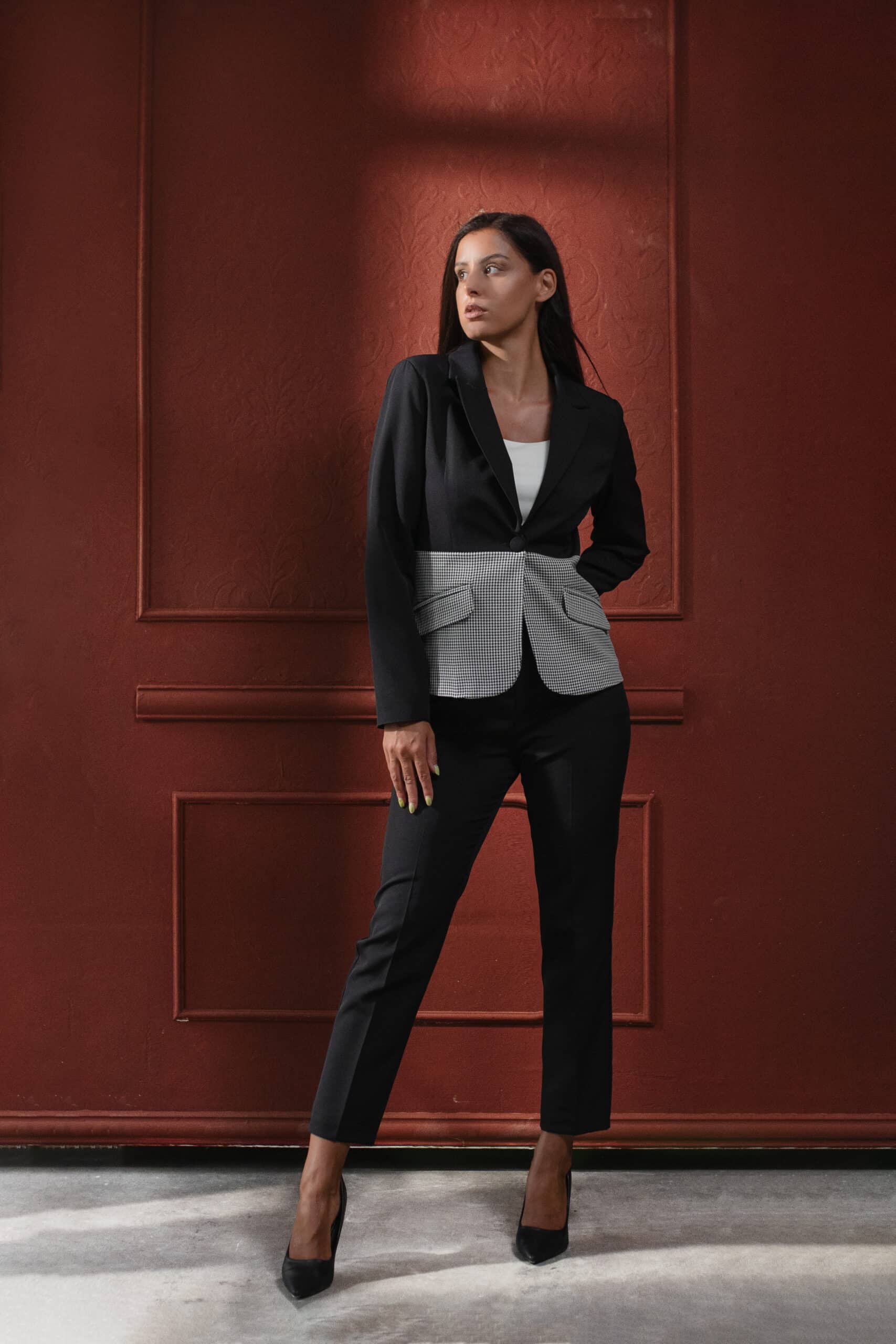Komplet koji nije samo odeća – to je izjava o stavu, eleganciji i moći žene koja zna svoju vrednost. Crno-beli komplet spaja klasičnu eleganciju i moderan dizajn u komadu koji osnažuje ženu svojim stavom. Strukirani sako sa pepita detaljem u predelu struka naglašava figuru i stvara sofisticiranu siluetu, dok elegantne pantalone ravnog kroja pružaju udobnost i lakoću pokreta.