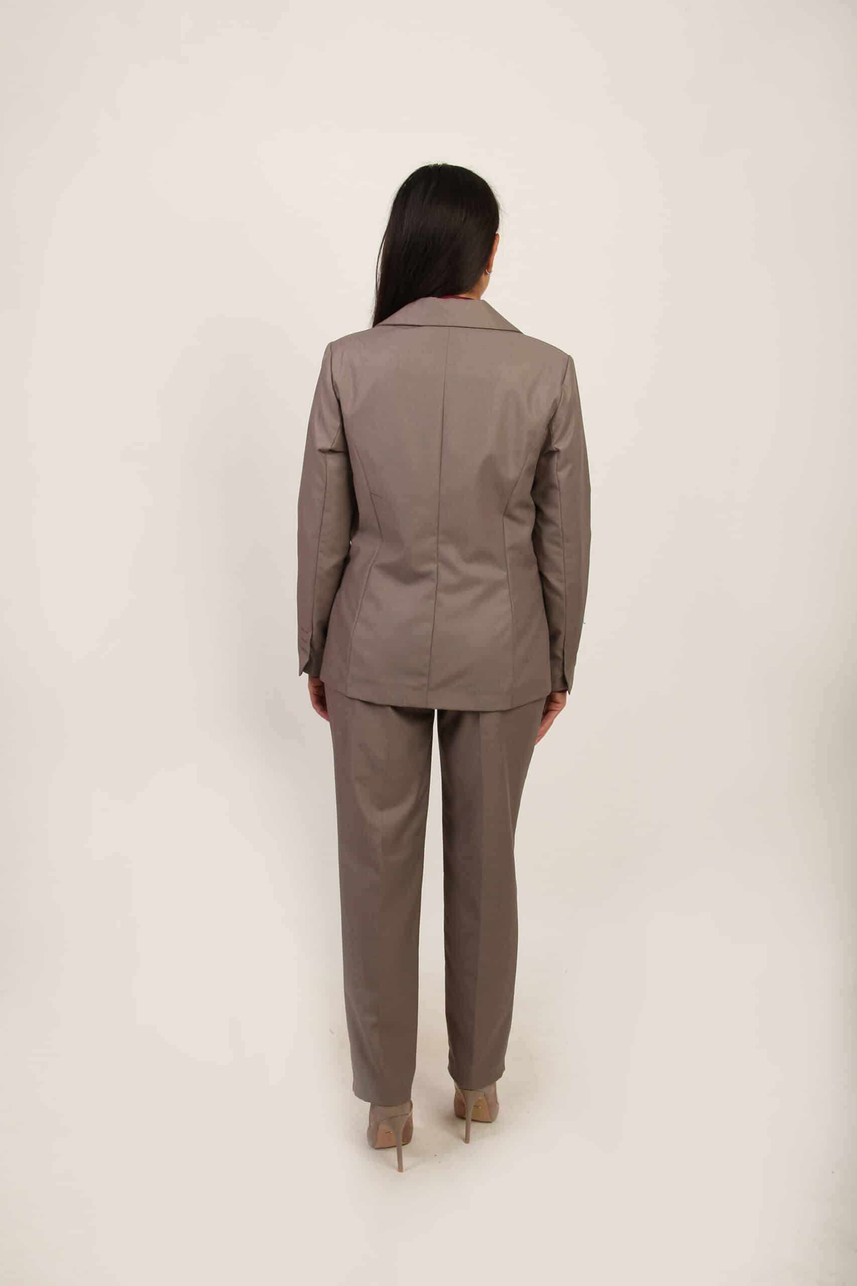 Ženski komplet u nežnoj smedjoj nijansi donosi savršenu ravnotežu elegancije, udobnosti i poslovnog stila. Sako je krojen tako da naglasi liniju ramena i struk, dok jednostavna silueta pantalona vizuelno izdužuje noge i pruža vrhunsku udobnost tokom celog dana.