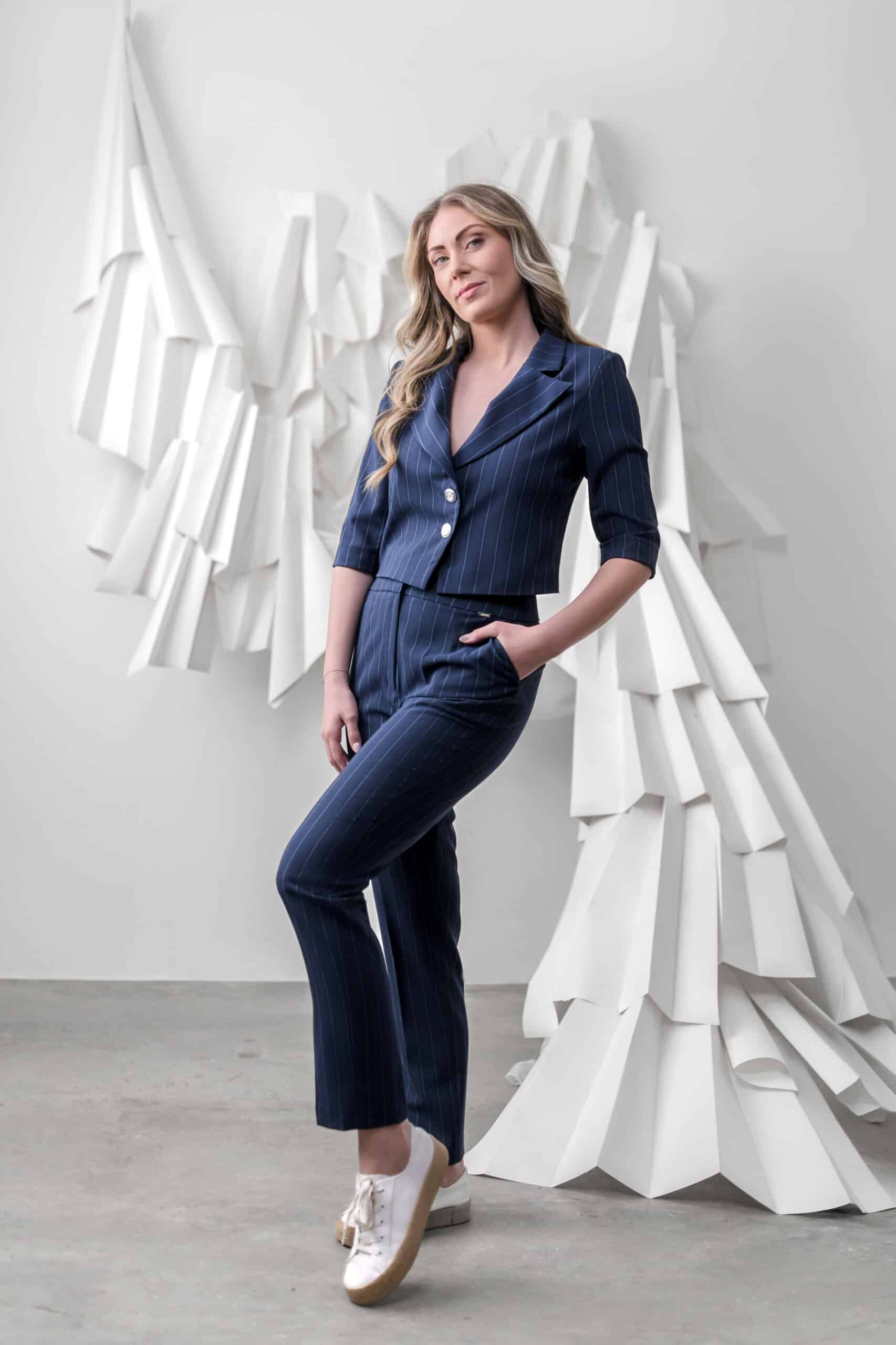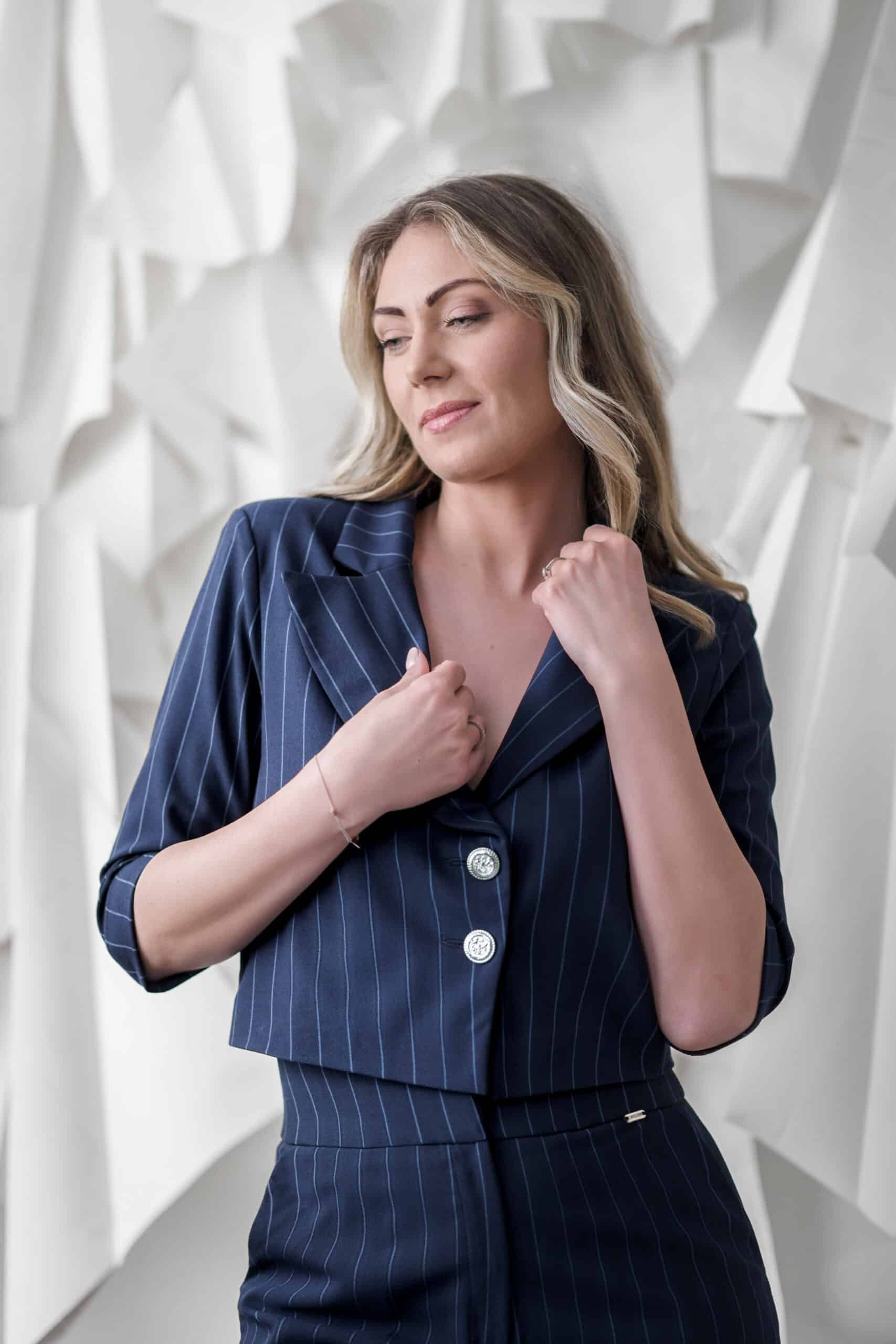 Moderan poslovni stil dobija novu dimenziju kroz ovaj teget ženski komplet sa diskretnim prugama koji spaja eleganciju i urbanu energiju. Strukirani kratki sako sa naglašenim reverima i dekorativnim dugmadima naglašava liniju tela, dok pantalone uskog kroja pružaju sofisticiran i uredan izgled.