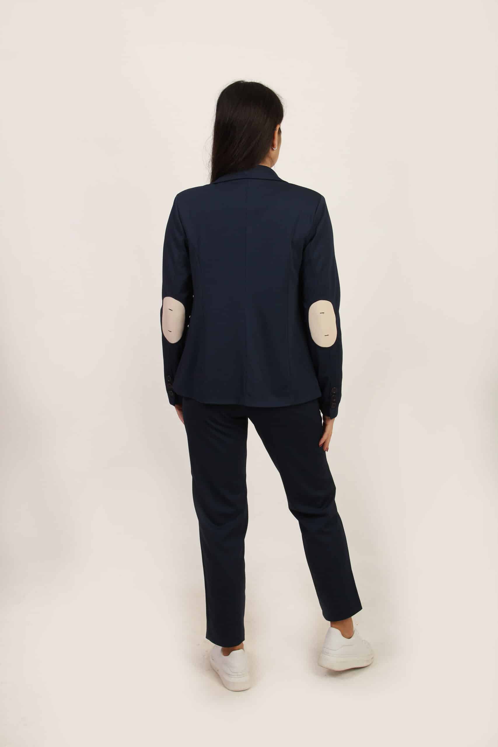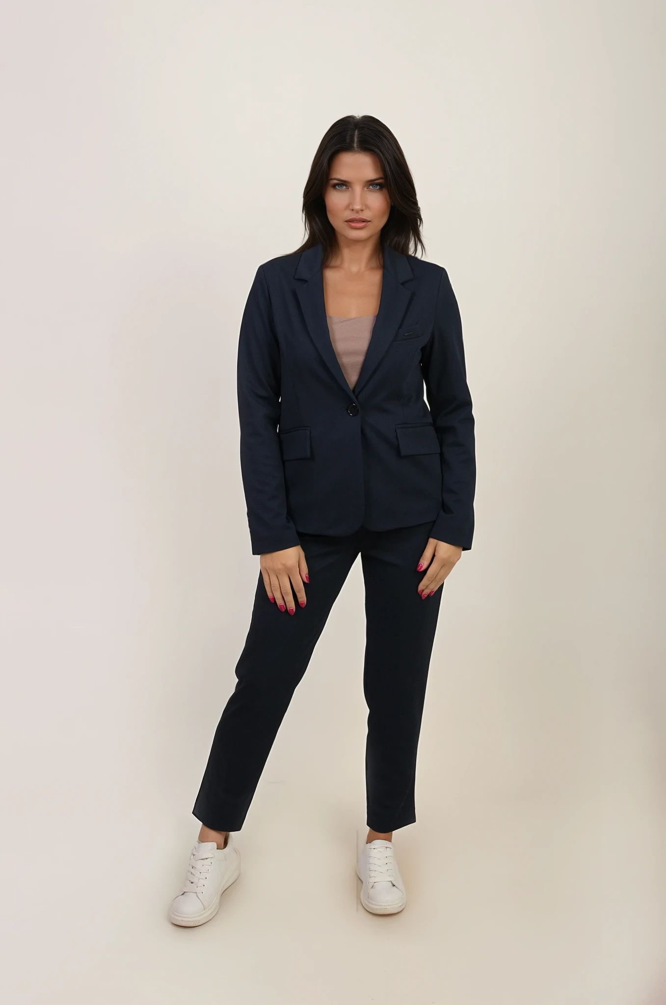 Sako je krojen tako da lagano prati figuru, sa čistim linijama i savršenim proporcijama koje vizuelno izdužuju gornji deo tela. Jedno kopčanje omogućava uredan, minimalistički izgled, dok diskretni detalji na manžetnama dodaju prefinjenu notu. Pantalone su uskog, elegantnog kroja koji vizuelno izdužuje noge i uklapa se uz sve tipove obuće — od poslovnih štikli do urbanih patika.