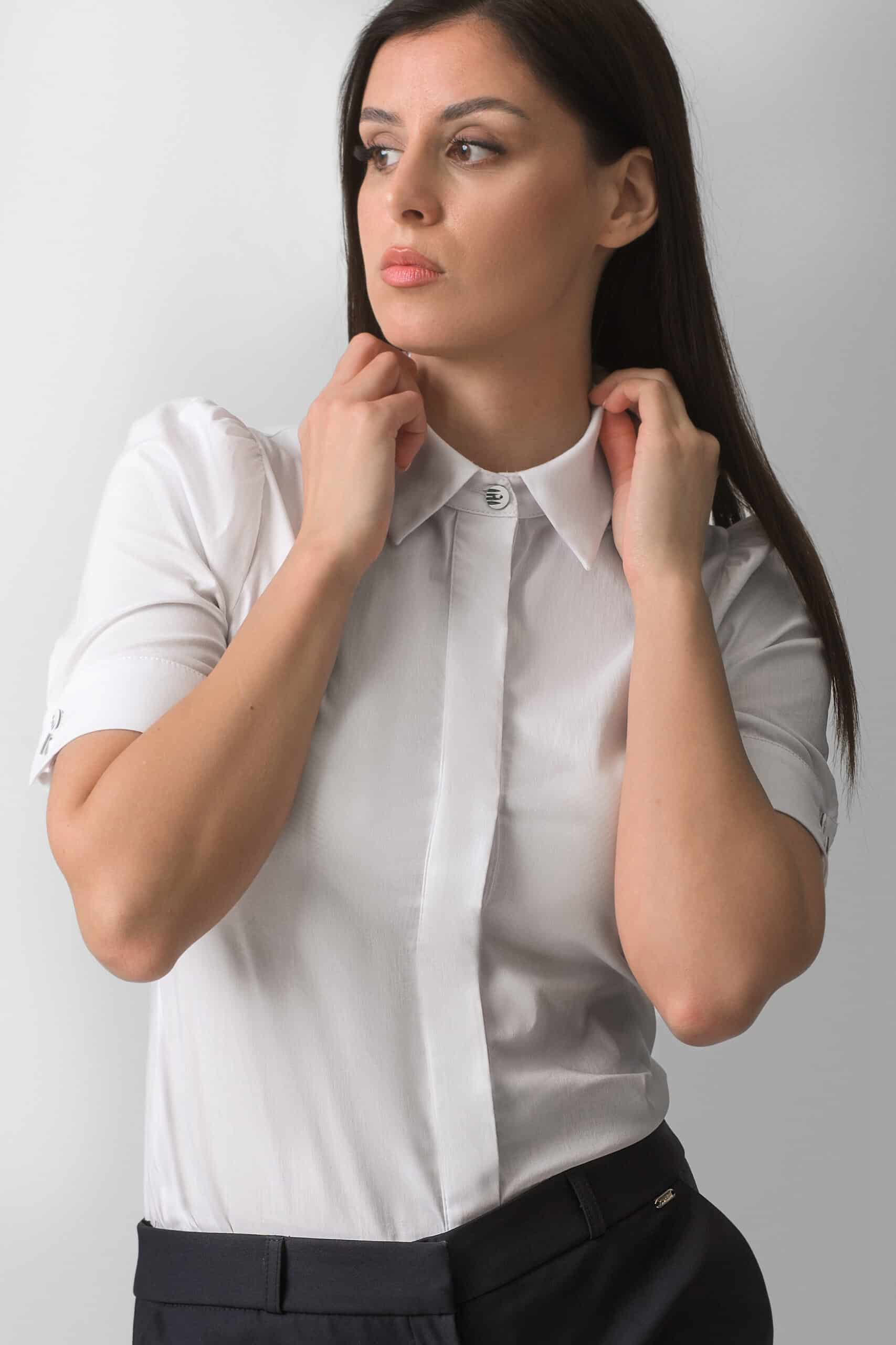 Elegantna ženska bela košulja sa klasičnom kragnom i kratkim rukavima predstavlja savršen izbor za poslovni stil i sofisticirane svakodnevne kombinacije. Minimalistički dizajn i čiste linije kroja daju ovoj bluzi moderan i profesionalan izgled, dok lagani i prijatan materijal omogućava udobnost tokom celog dana.
