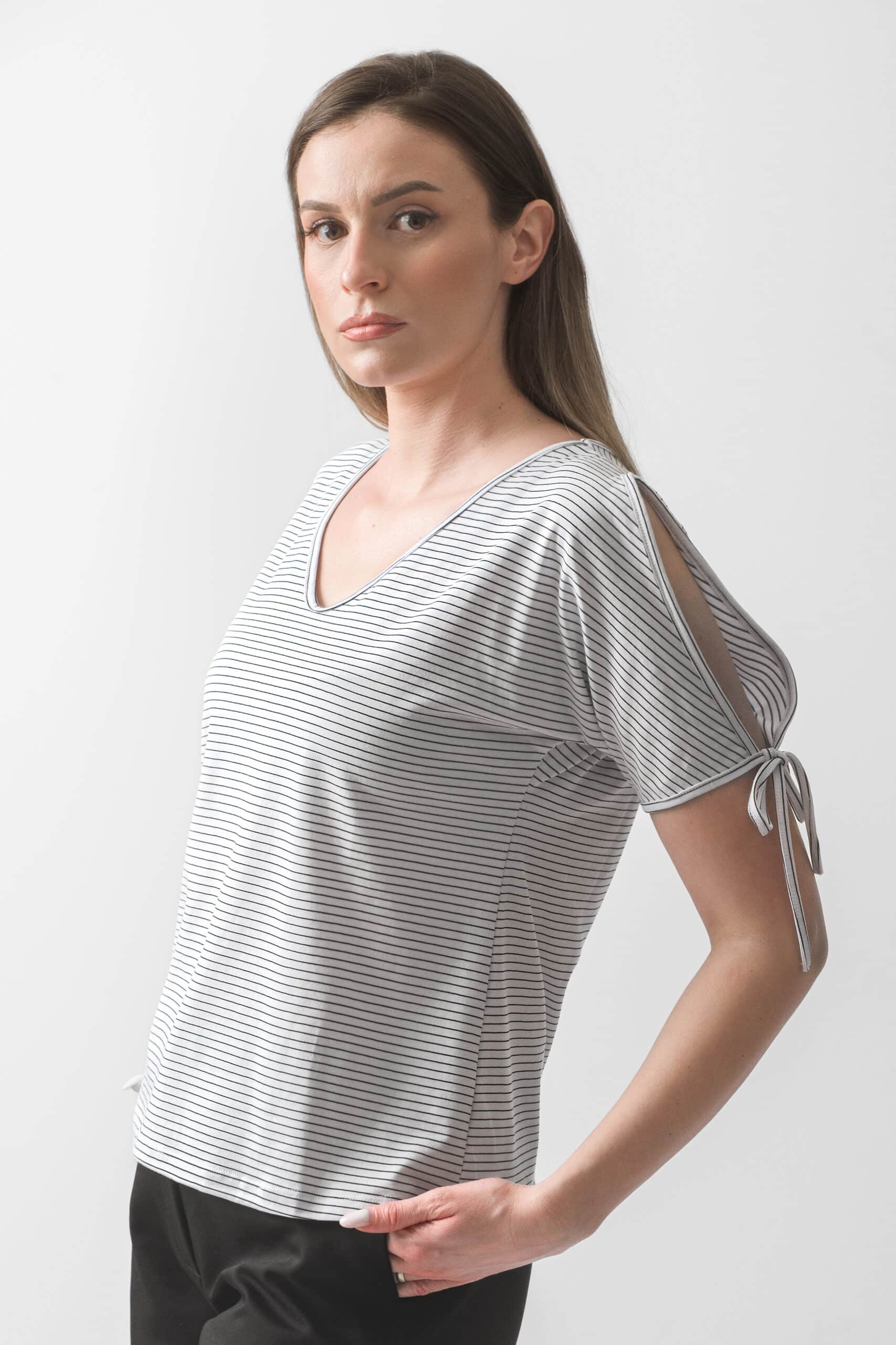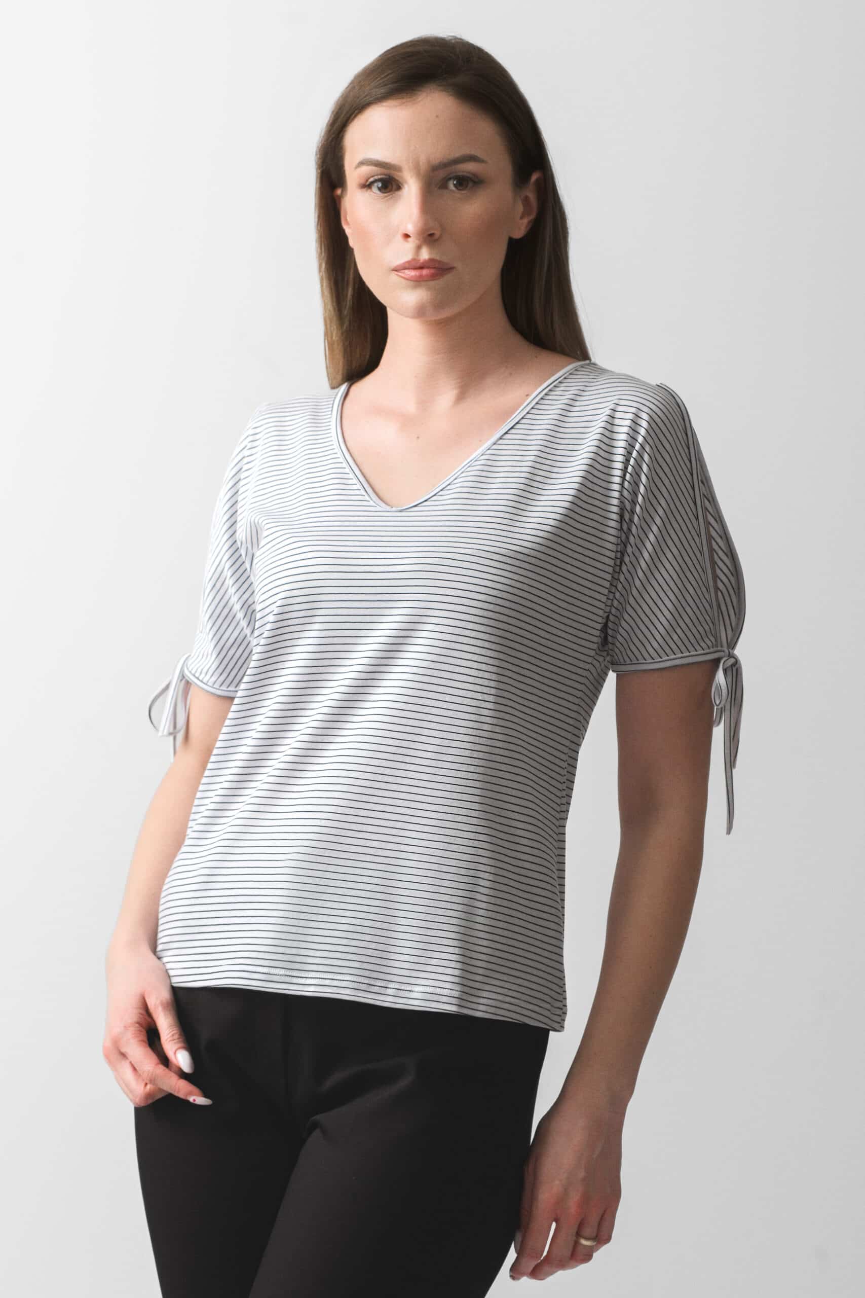 Poseban akcenat daju rukavi sa dekorativnim vezivanjem koji unose suptilan ženstveni detalj i čine model modernim i drugačijim. Diskretne horizontalne pruge doprinose jednostavnom, ali sofisticiranom izgledu koji se lako uklapa uz pantalone, suknje ili farmerke.