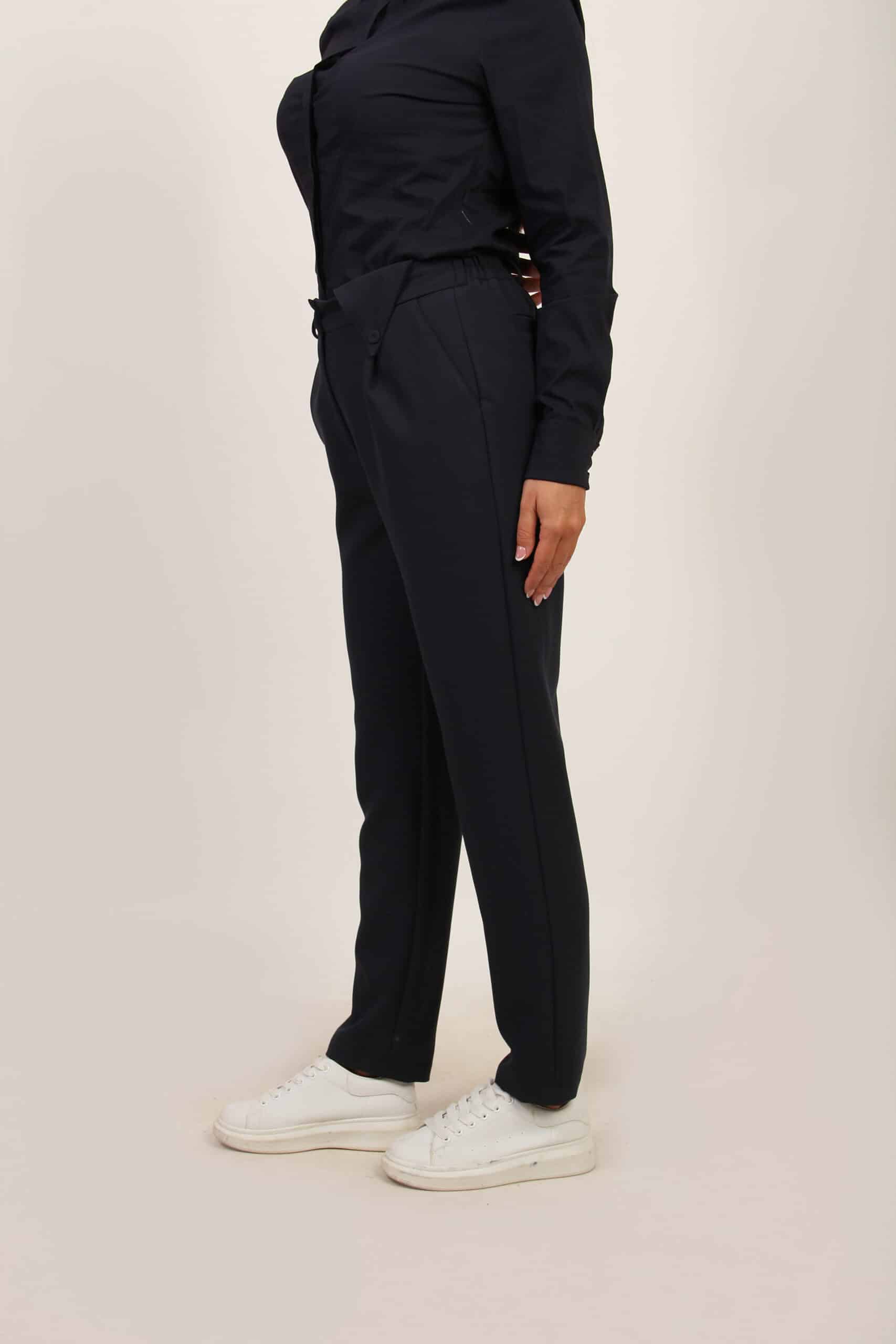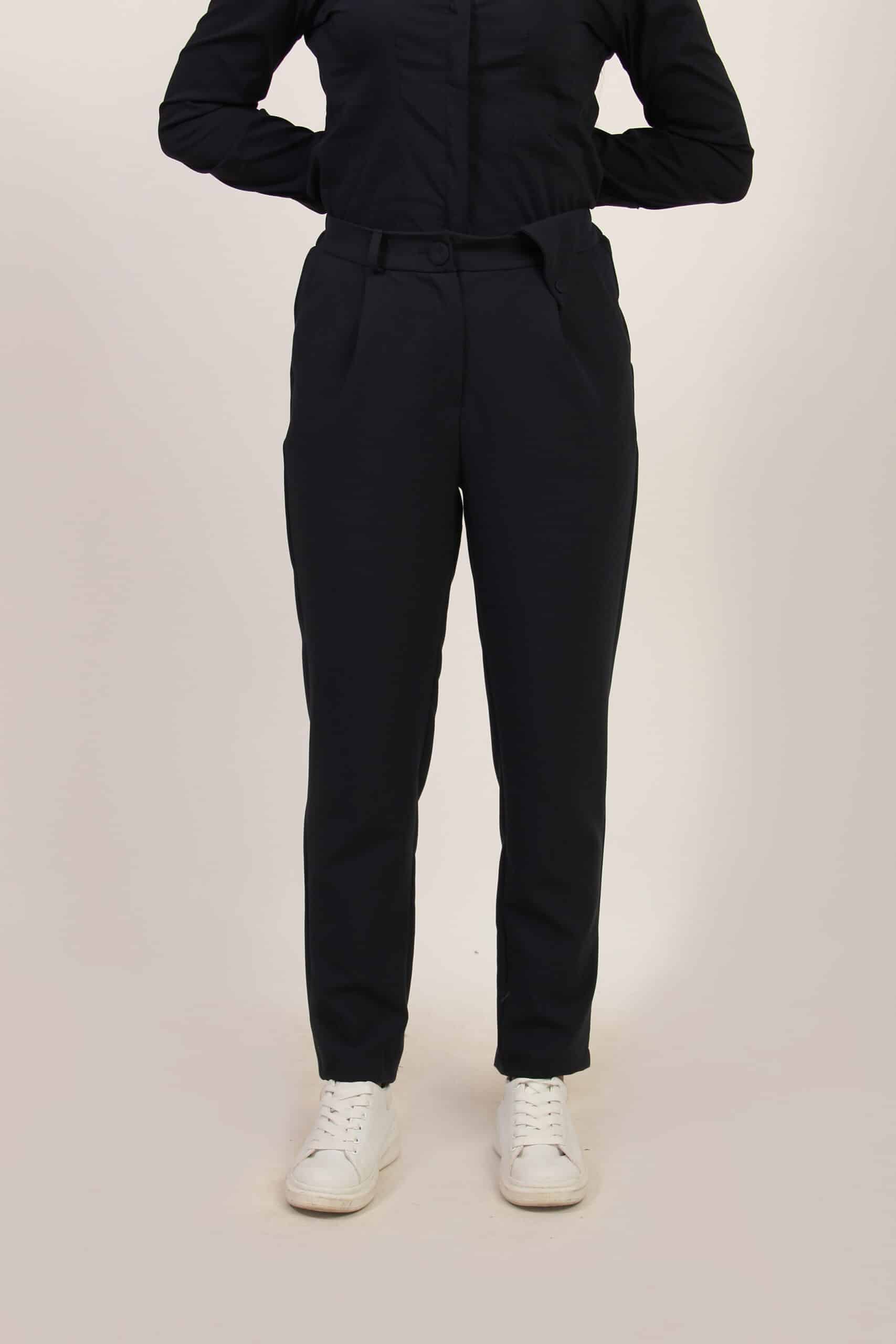 Elegantne crne pantalone visokog struka namenjene ženama koje biraju komfor bez odricanja od stilskog izraza. Kroj prati liniju tela i nežno je sužava ka članku, dok dekorativni kaiš naglašava struk i vizuelno izdužuje siluetu.