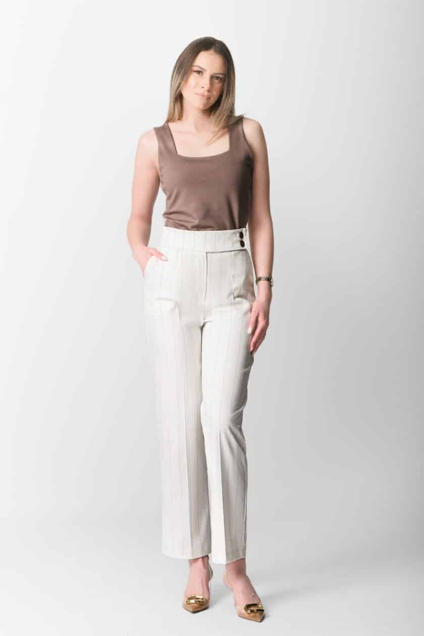 Diskretni dugmići na pojasu i čiste linije dizajna daju modelu moderan i luksuzan izgled, dok neutralna boja omogućava lako kombinovanje sa košuljama, bluzama ili elegantnim sakoom. Ovaj model je savršen za žene koje žele uredan, profesionalan i bezvremenski stil u svakodnevnim kombinacijama.