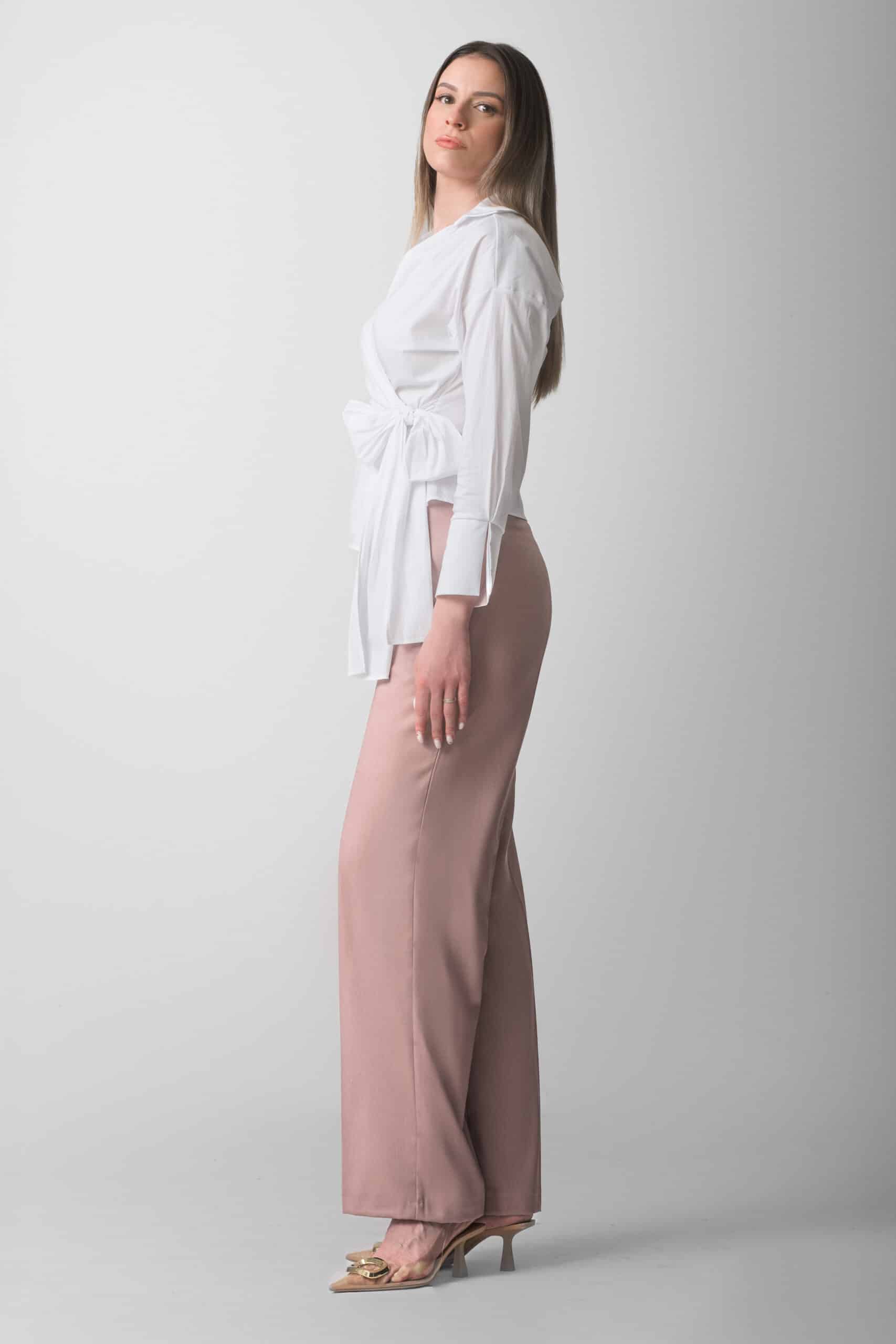 Elegantne ženske pantalone u nežnoj puder roze nijansi predstavljaju savršen spoj sofisticiranog poslovnog stila i moderne ženstvenosti. Visok struk i ravne nogavice vizuelno izdužuju siluetu, dok lagani materijal pruža udobnost tokom celog dana. Minimalistički kroj sa čistim linijama čini ove pantalone idealnim izborom za poslovne prilike, formalne događaje i elegantne dnevne outfite.