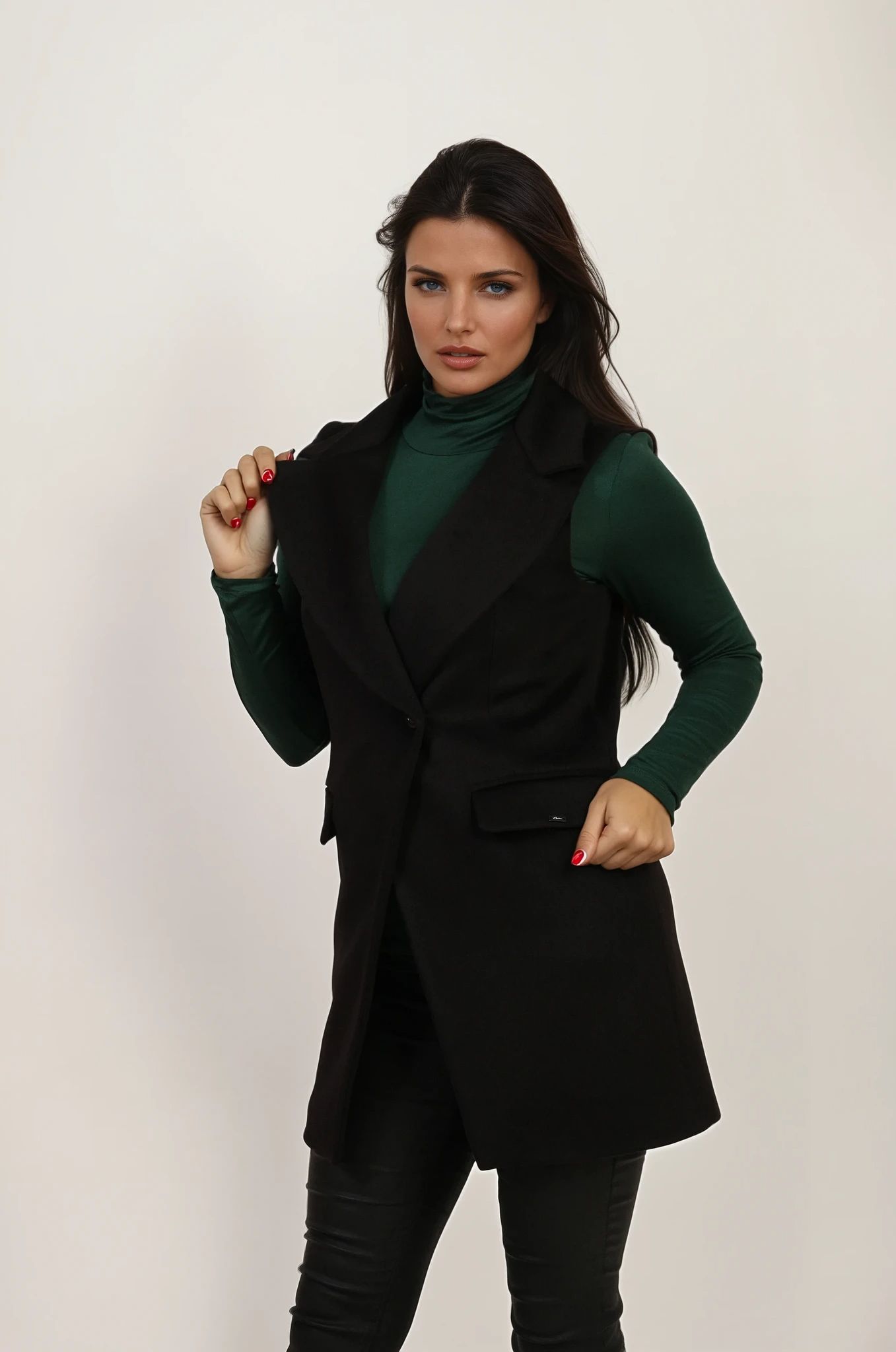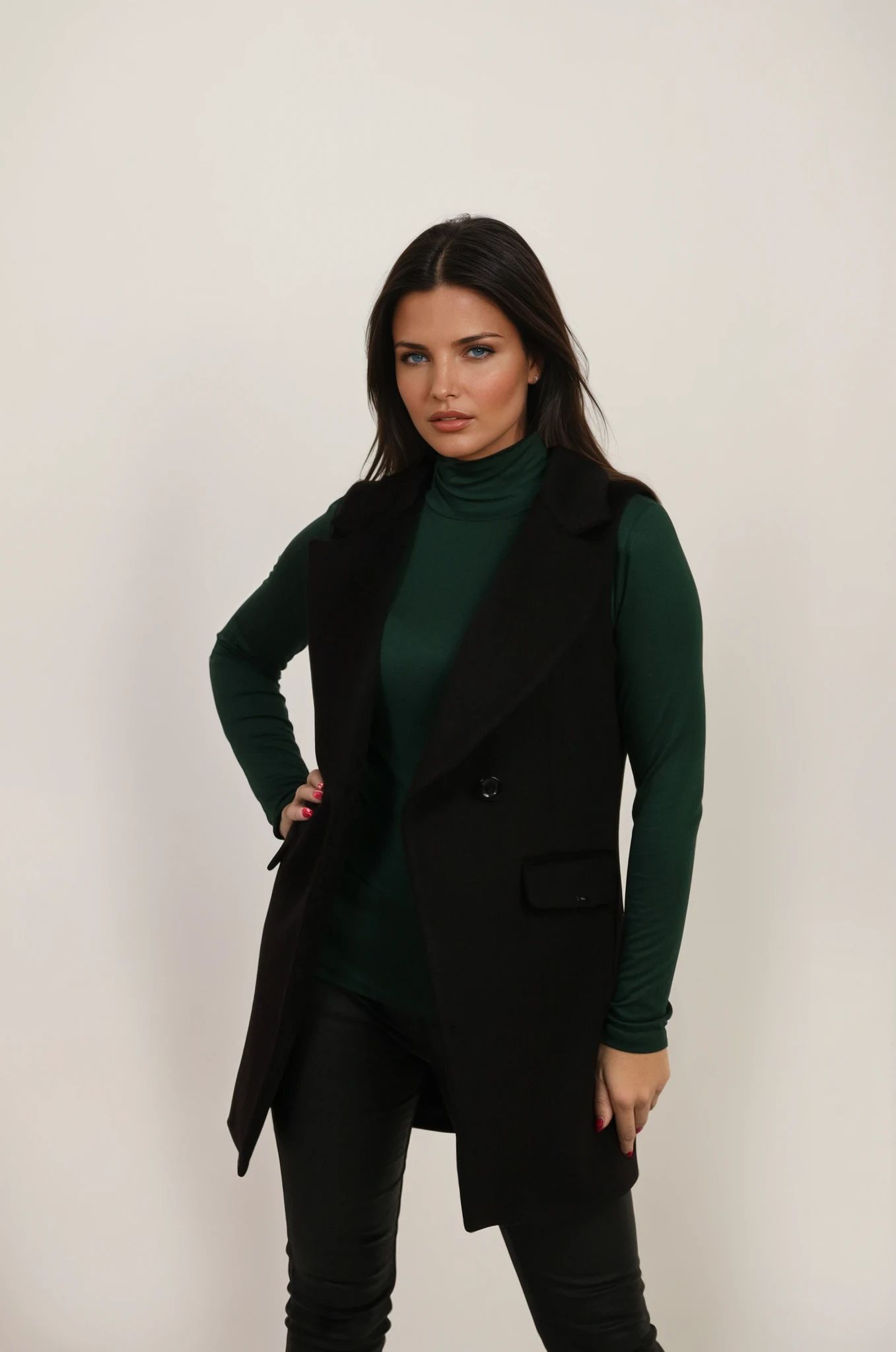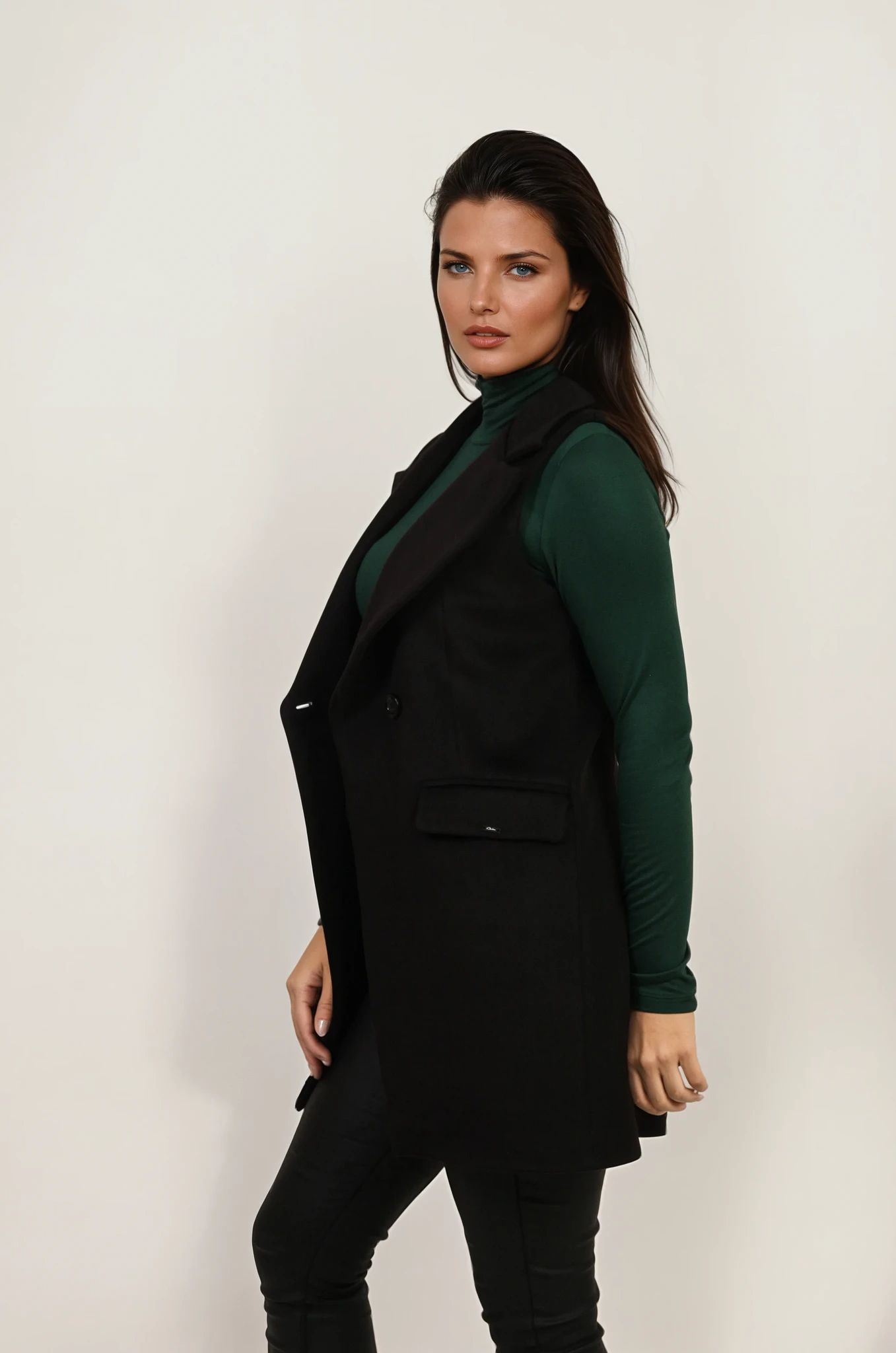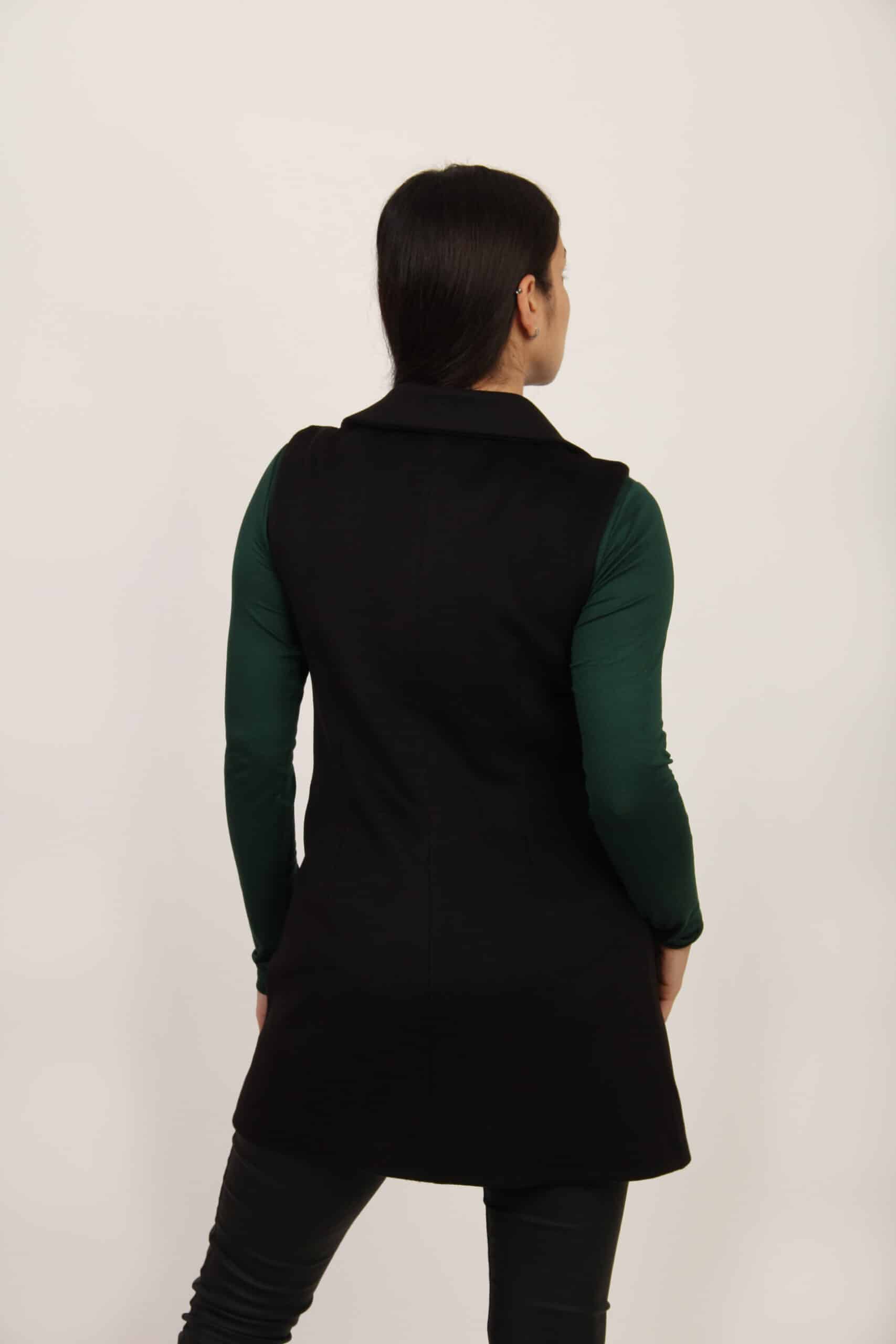 Ovaj elegantni crni prsluk predstavlja savršen spoj poslovne sofisticiranosti i moderne jednostavnosti. Dizajniran sa dužim, ravnim krojem koji vizuelno izdužuje siluetu, prsluk pruža efekat profinjenosti u svakom outfitu — bilo da ga nosite uz rolku, košulju ili bluzu.