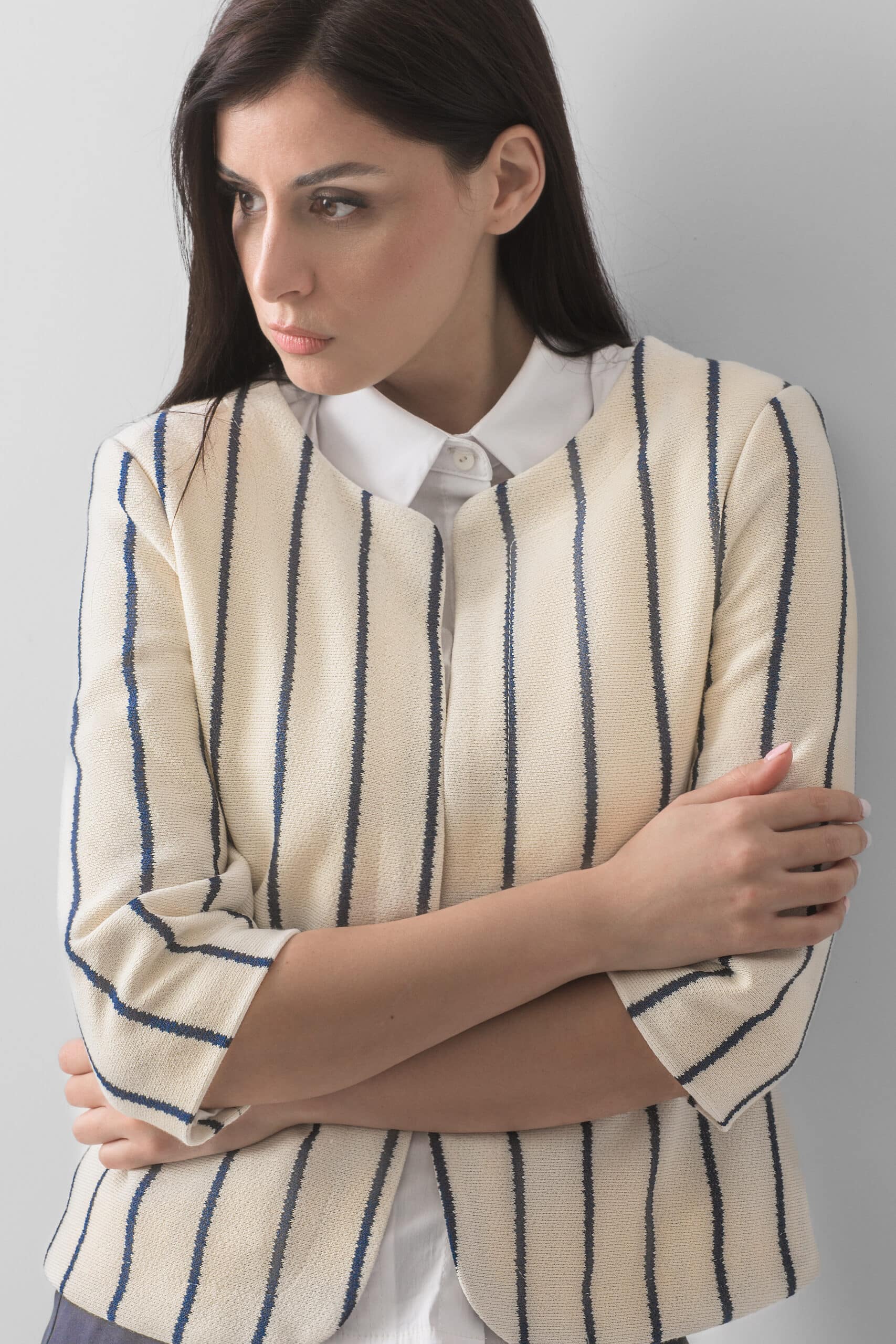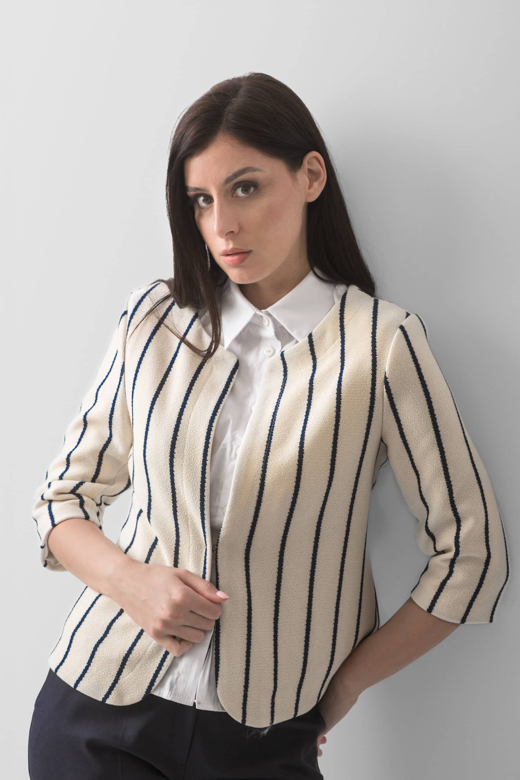Elegantni ženski sako sa vertikalnim prugama predstavlja savršen spoj klasične elegancije i modernog poslovnog stila. Neutralna svetla osnova sa tamnim prugama vizuelno izdužuje siluetu i daje sofisticiran izgled, dok minimalistički kroj bez revera donosi savremenu notu. Strukturirani materijal pruža stabilnost formi i naglašava ženstvenu liniju, čineći ovaj model idealnim izborom za poslovne i smart casual kombinacije.