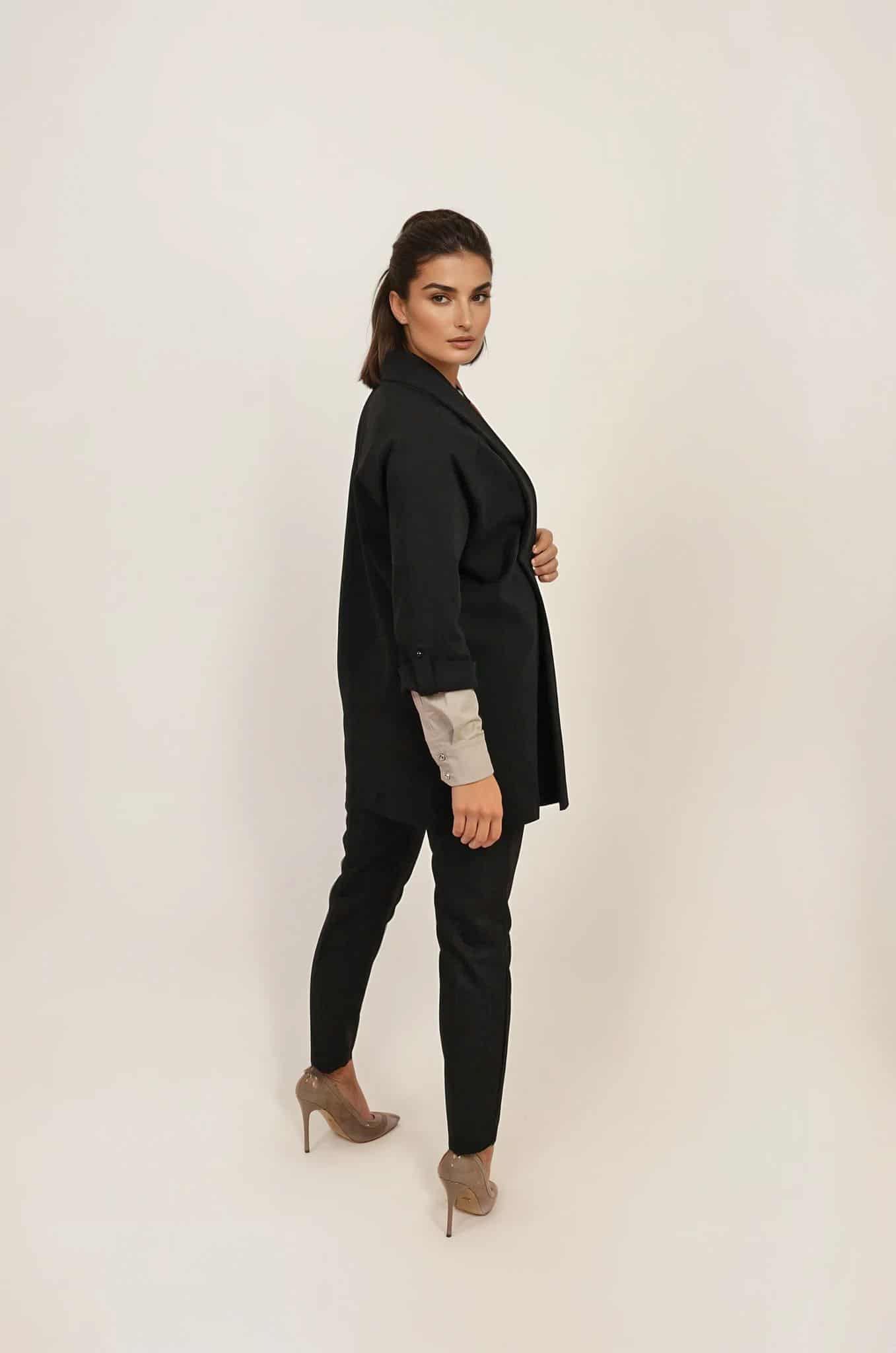 Crna elegantna tunika predstavlja savršen spoj minimalizma, funkcionalnosti i bezvremenskog stila. Dizajnirana u ravnom kroju koji nežno prati liniju tela, tunika pruža sofisticiran izgled uz maksimalnu udobnost, čineći je idealnim izborom za poslovne kombinacije, svakodnevne outfite i smart-casual prilike.
