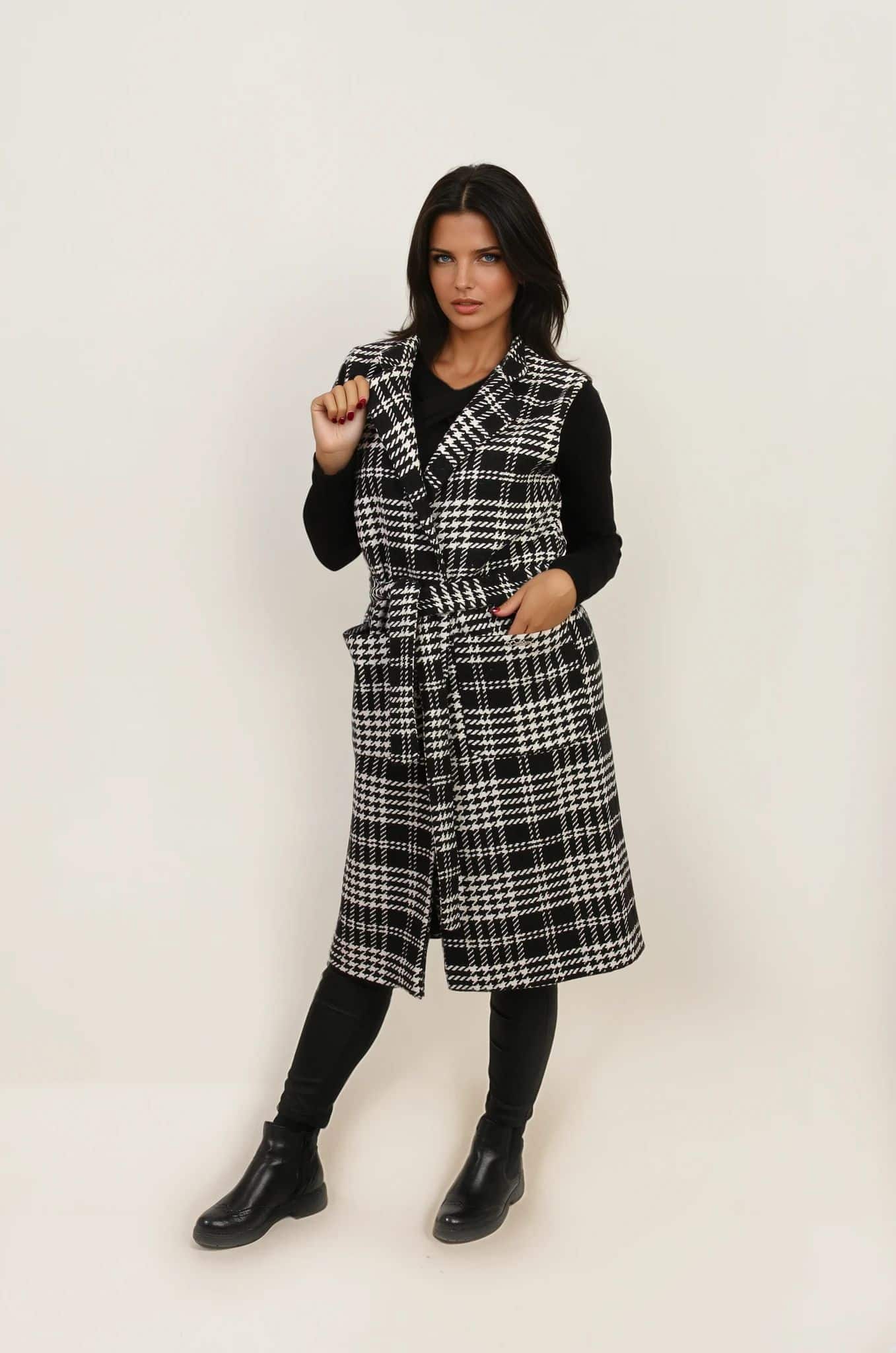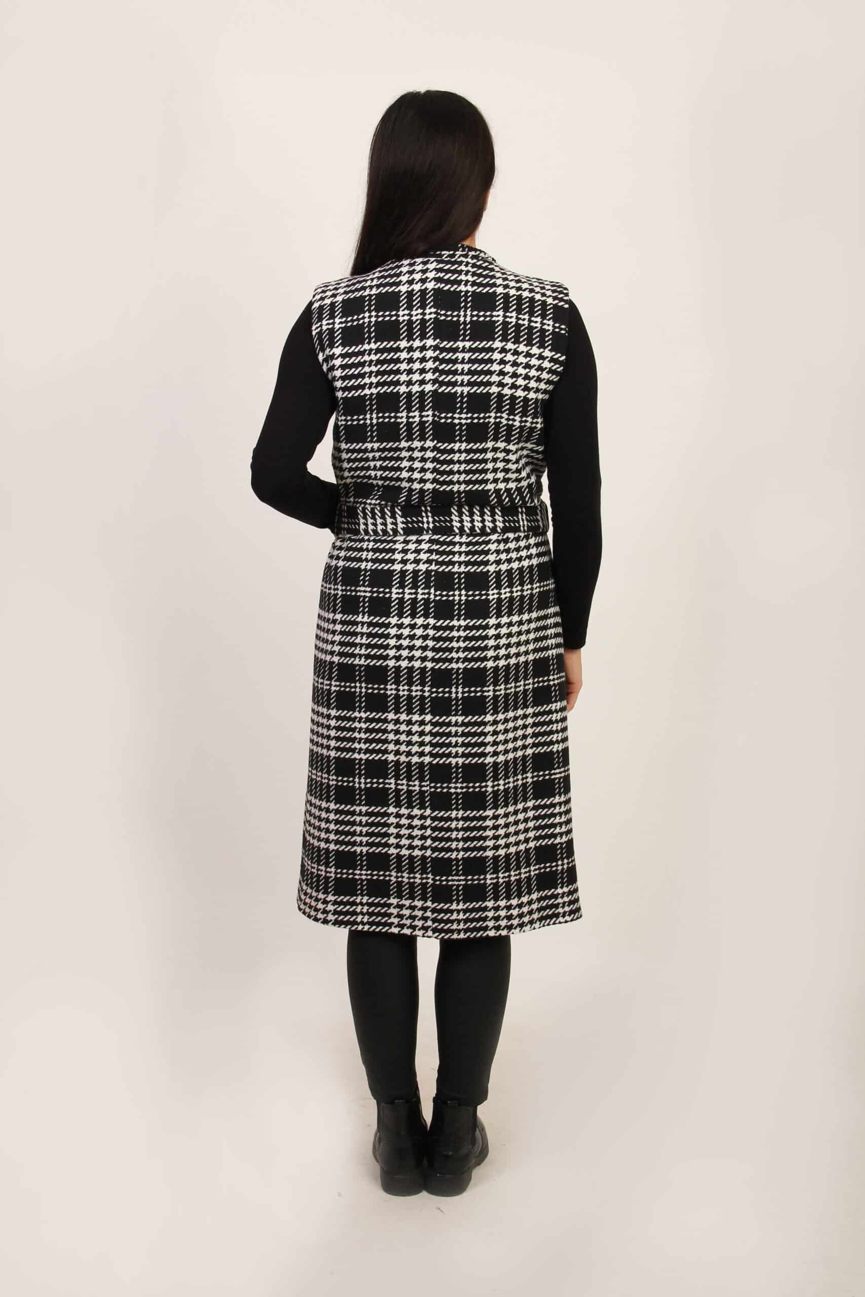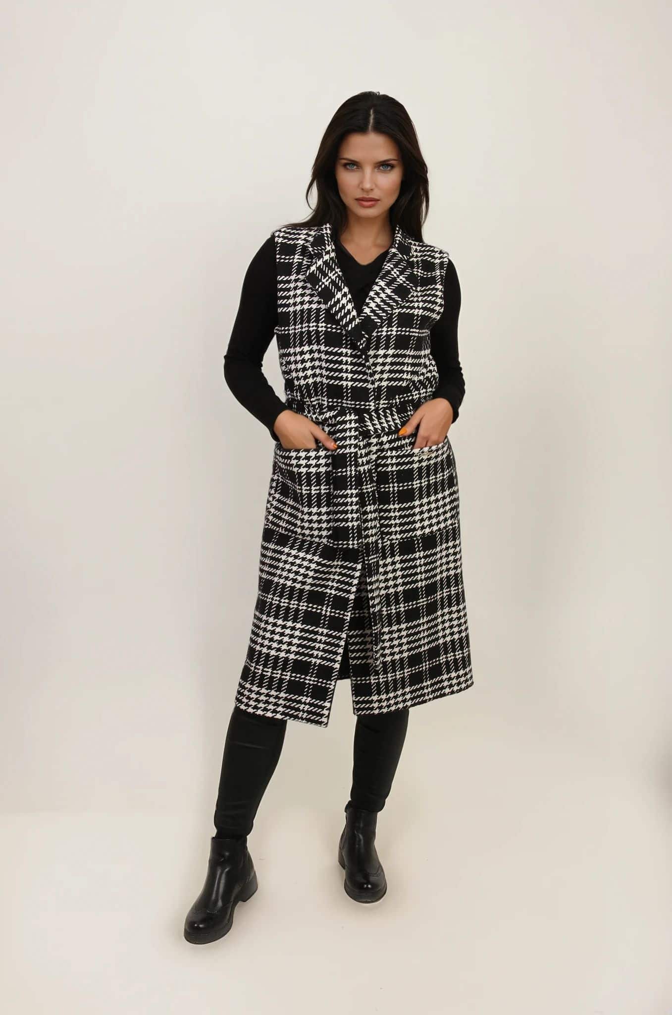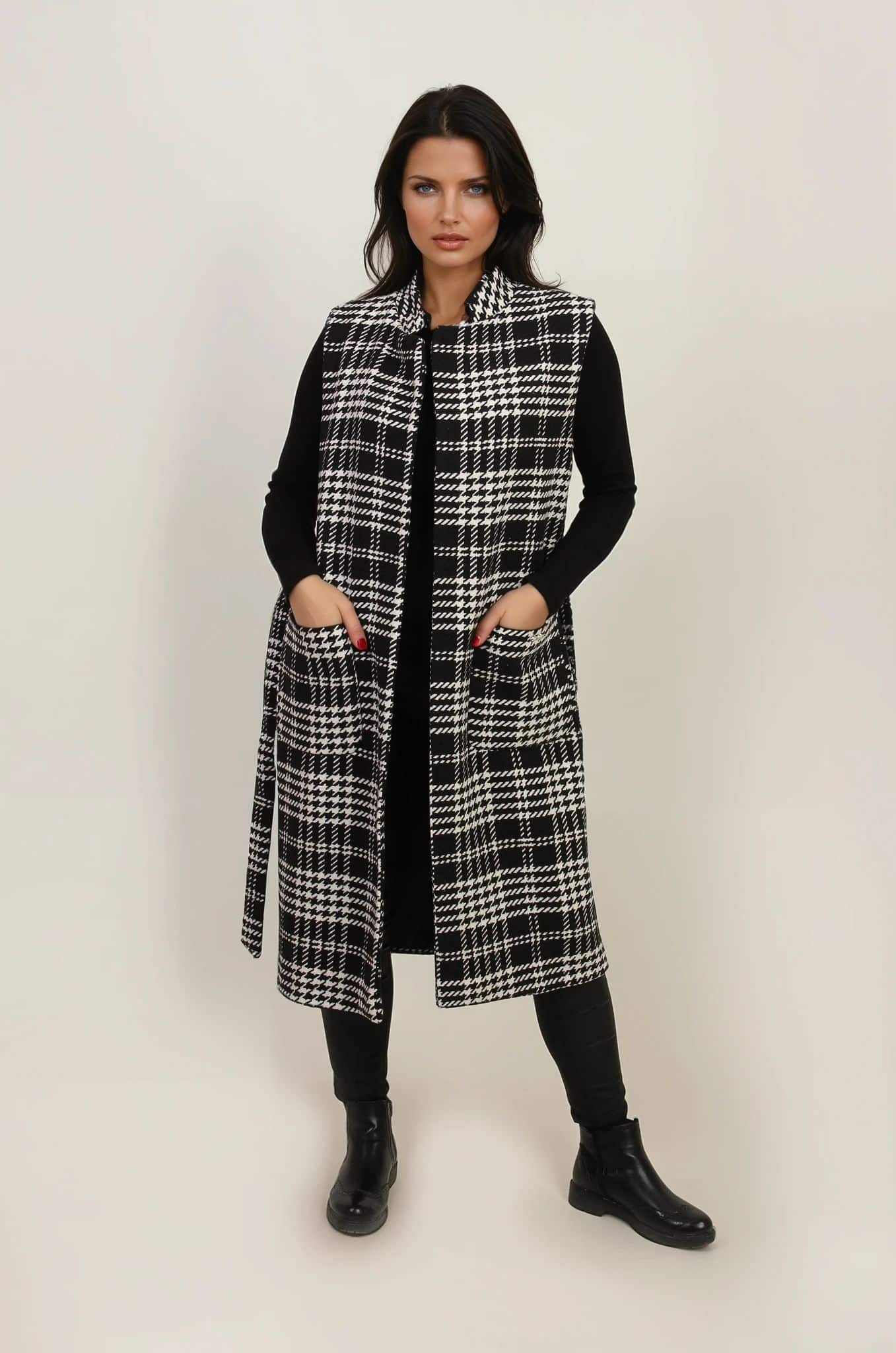 Duga ženska tunika u klasičnom pepito dezenu donosi savršenu ravnotežu sofisticiranog stila i praktičnosti. Moderan kroj bez rukava čini ga idealnim slojem za prelazne sezone, dok dužina ispod kolena izdužuje figuru i daje efektan, elegantan izgled.